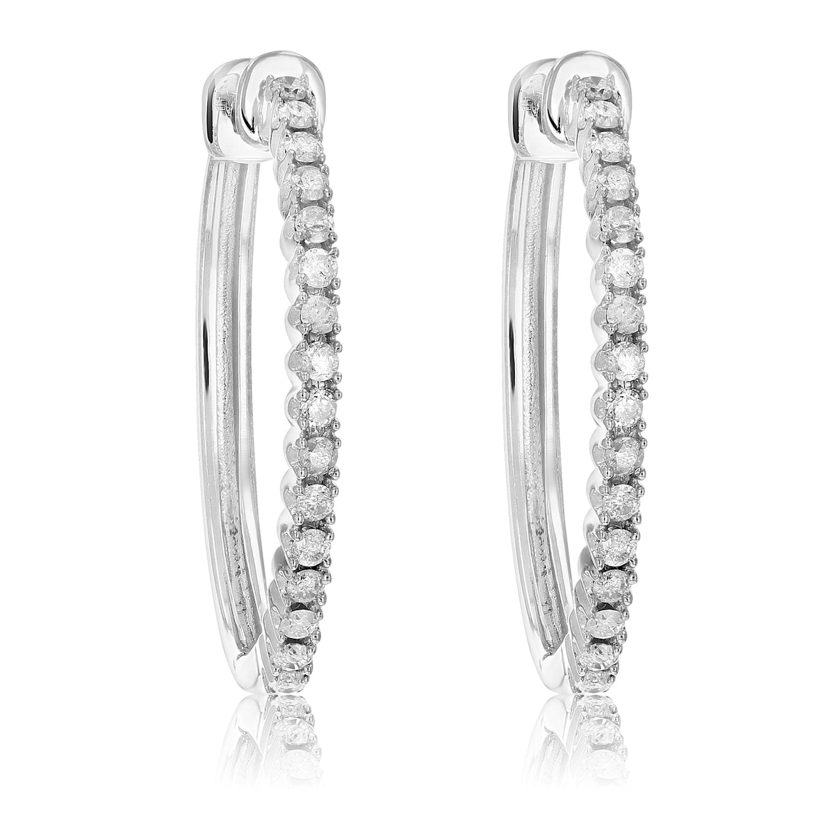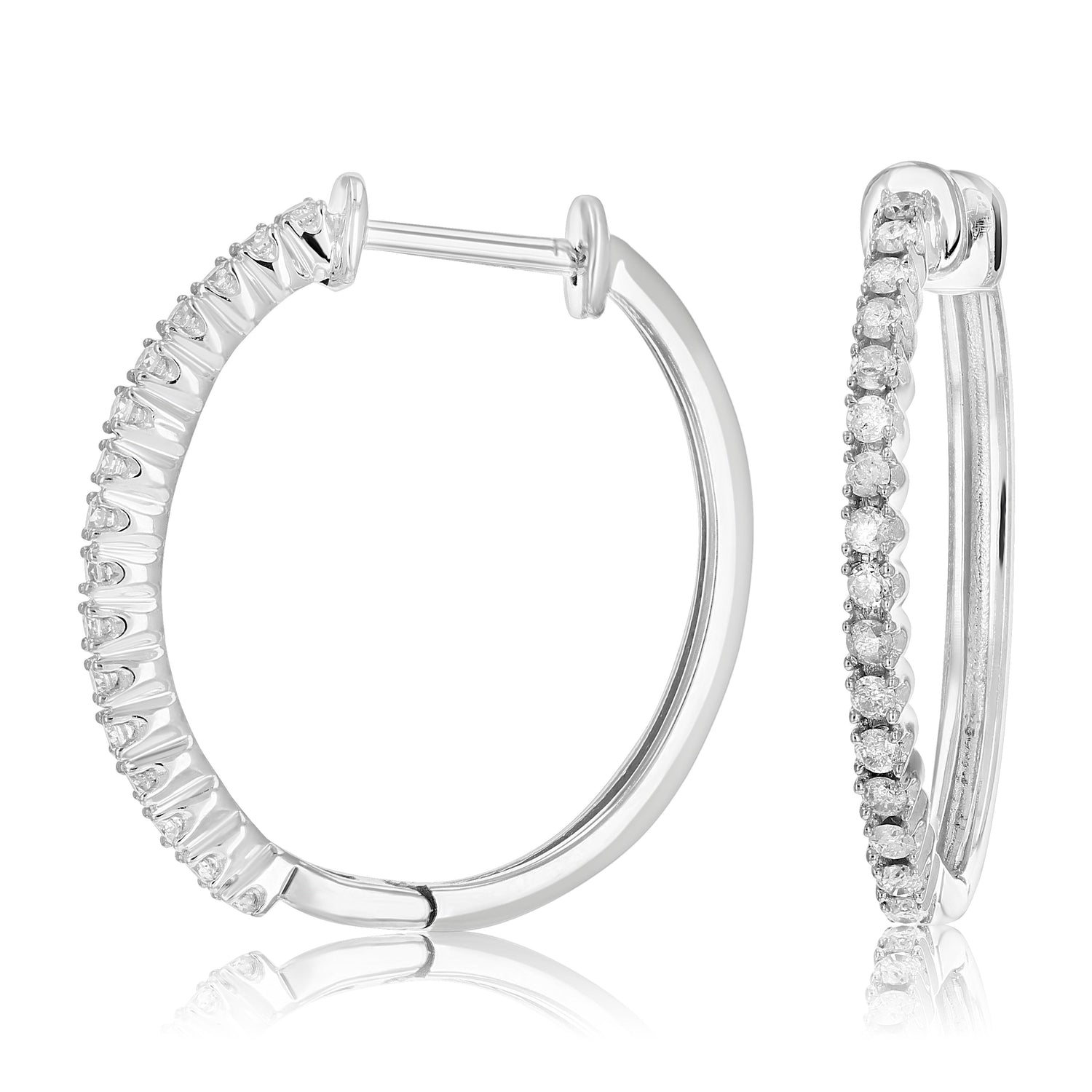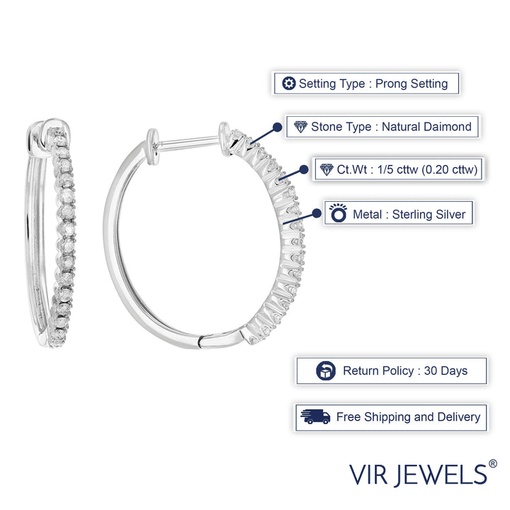 These 1/5 cttw Diamond Hoop Earrings in .925 Sterling Silver by Vir Jewels are beautifully crafted with 32 natural round diamonds prong-set within a sterling silver hoop. Their all-around sparkle and timeless design make them a versatile addition to any jewelry collection, perfect for everyday wear or as a special gift.