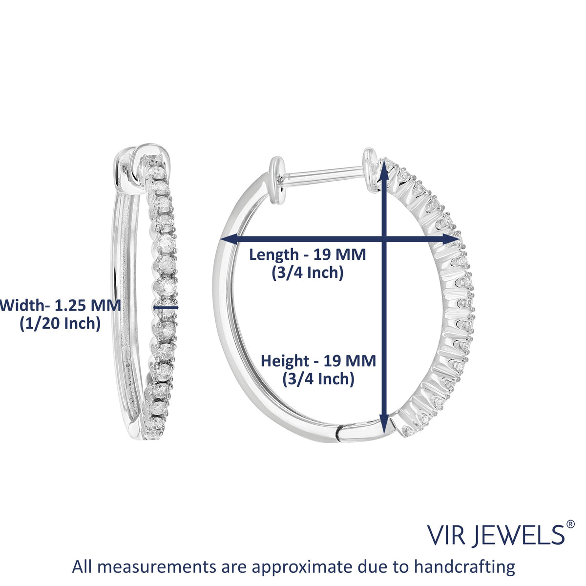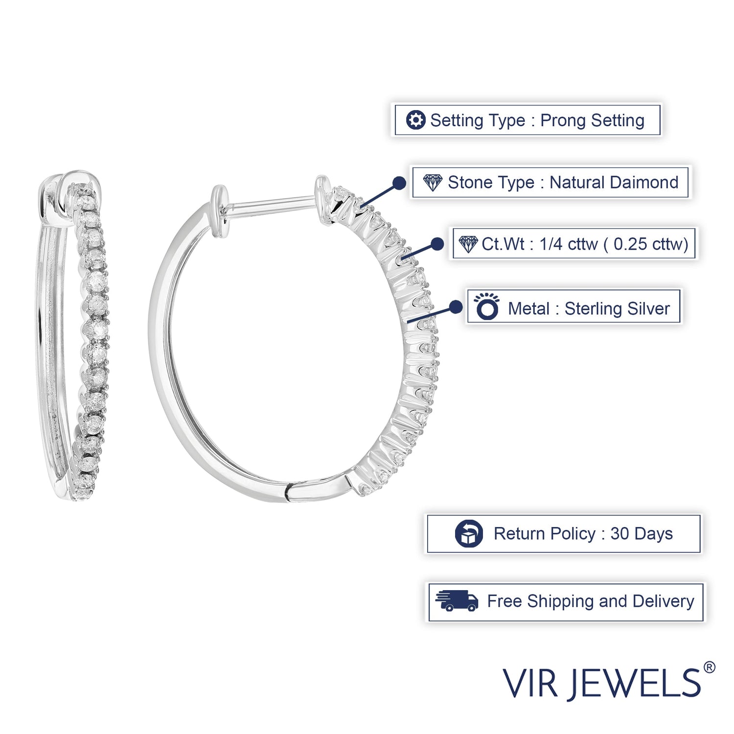 These 1/4 cttw Diamond Hoop Earrings in .925 Sterling Silver by Vir Jewels feature 30 natural round diamonds prong-set in a sleek silver hoop. The inside-out design adds extra sparkle from every angle, making these earrings a versatile and elegant choice for daily wear or special occasions.
