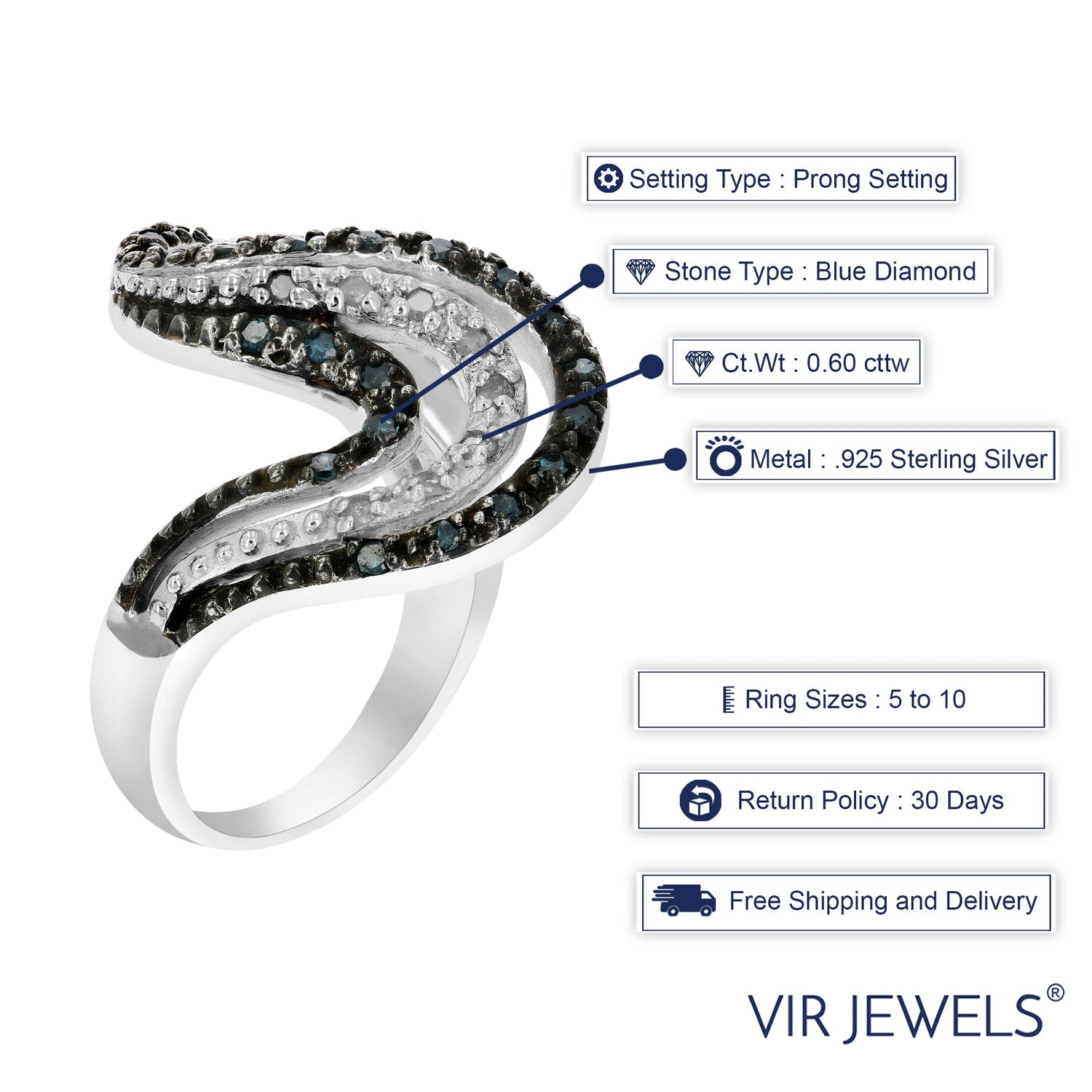 This blue and white diamond wave ring by Vir Jewels captivates with its fluid, shimmering design. Crafted in .925 sterling silver with rhodium plating, the ring showcases 29 blue diamonds and 16 white diamonds, totaling 0.60 cttw. The 24mm width and graceful curves make it a standout piece that radiates movement and elegance.