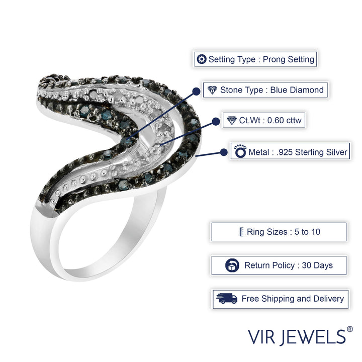 0.60 cttw Blue and White Diamond Wave Ring .925 Sterling Silver with Rhodium