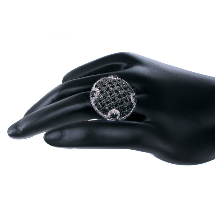 This black and white diamond ring by Vir Jewels is a striking, high-impact statement piece. Featuring an intricate arrangement of 109 black diamonds and 88 white diamonds, totaling 2.30 cttw, the design is set in .925 sterling silver with rhodium plating. The 24mm width gives the piece a bold, dramatic presence, perfect for those who love dazzling, statement jewelry.