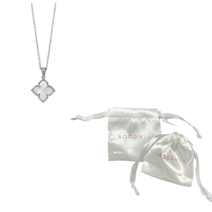 This Flower Mother of Pearl Necklace by Adornia is a refined statement of delicate beauty. The silver-white mother-of-pearl pendant, set in white rhodium over brass, radiates a soft luminescence, making it a versatile addition to any collection. The adjustable chain ensures a customizable fit for effortless elegance.