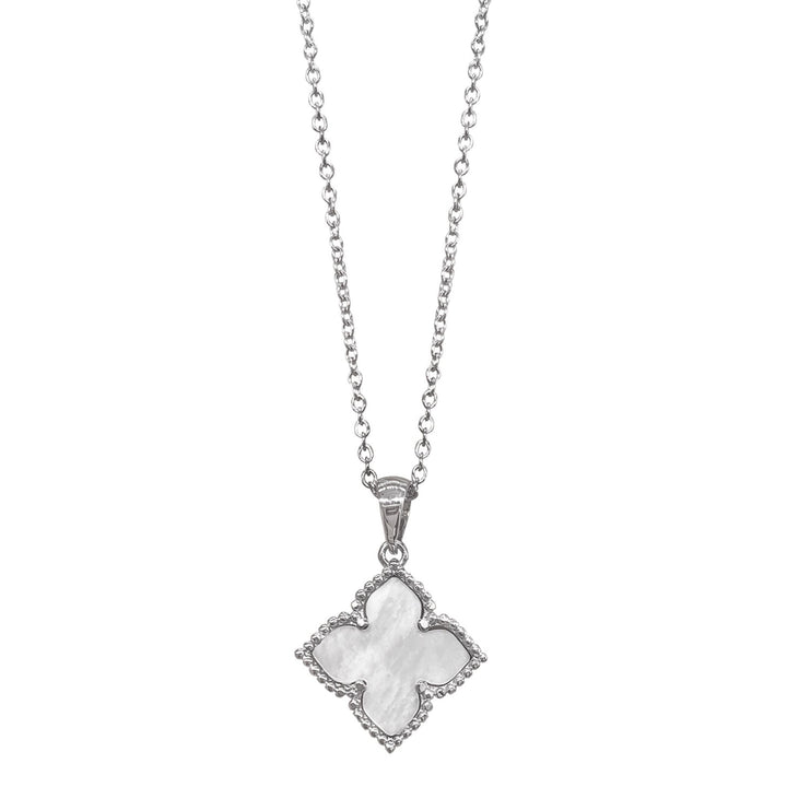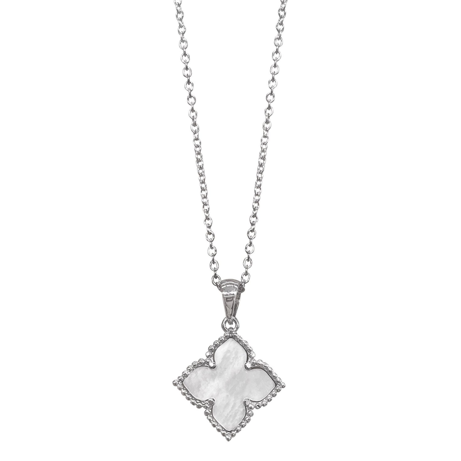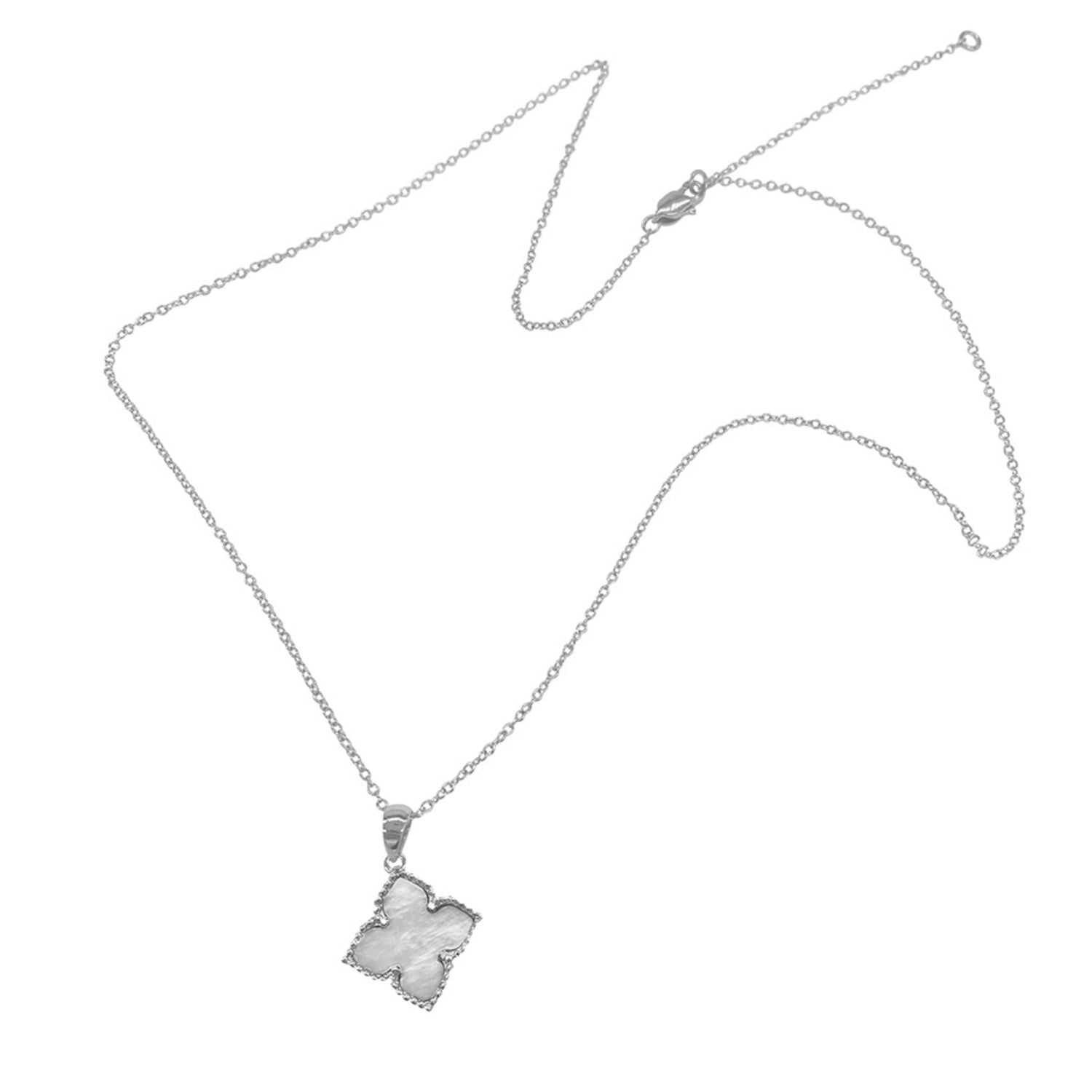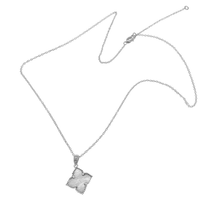 White rhodium over brass. Features a 16mm x 16mm mother-of-pearl pendant. Adjustable 16-18 inch chain with a lobster clasp.