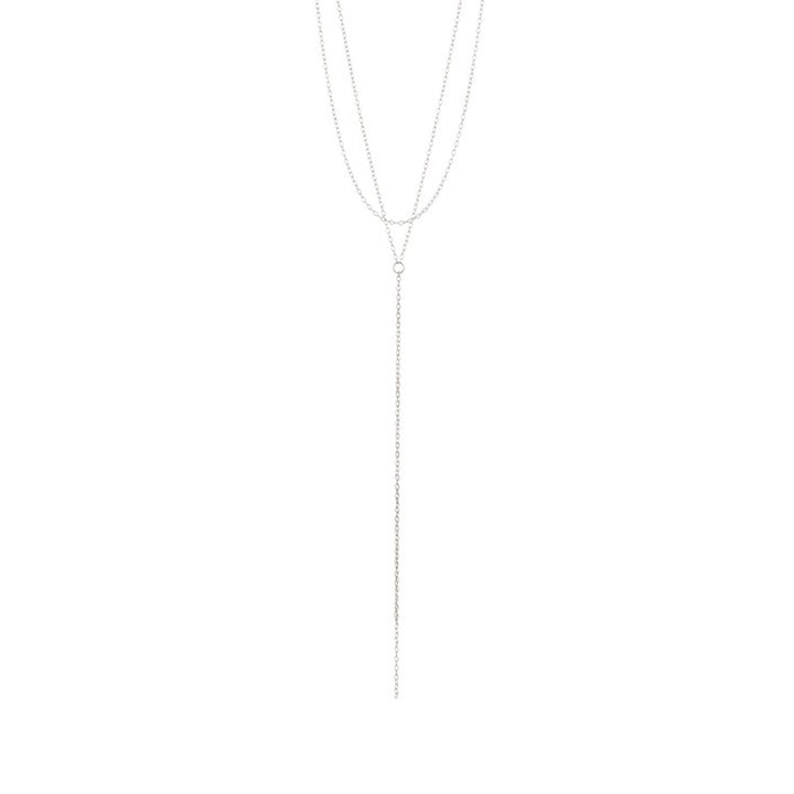 White rhodium-plated brass. Features a double-strand design with a front Y-drop. Adjustable 16-18 inch chain with a spring ring closure.