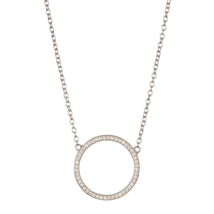 White rhodium-plated brass. Features a crystal-embellished infinity circle pendant. Pendant diameter: 0.6 inches. Adjustable 16-18 inch chain with a spring ring closure.