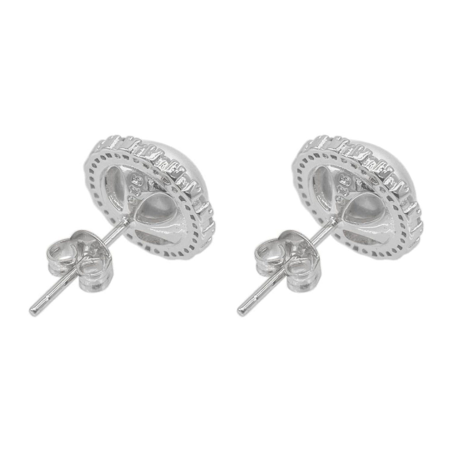 White rhodium-plated brass. Features an 8mm cultured freshwater pearl center with Swarovski crystal halo. Total earring diameter: 10mm. Post-back closure with butterfly fastening.