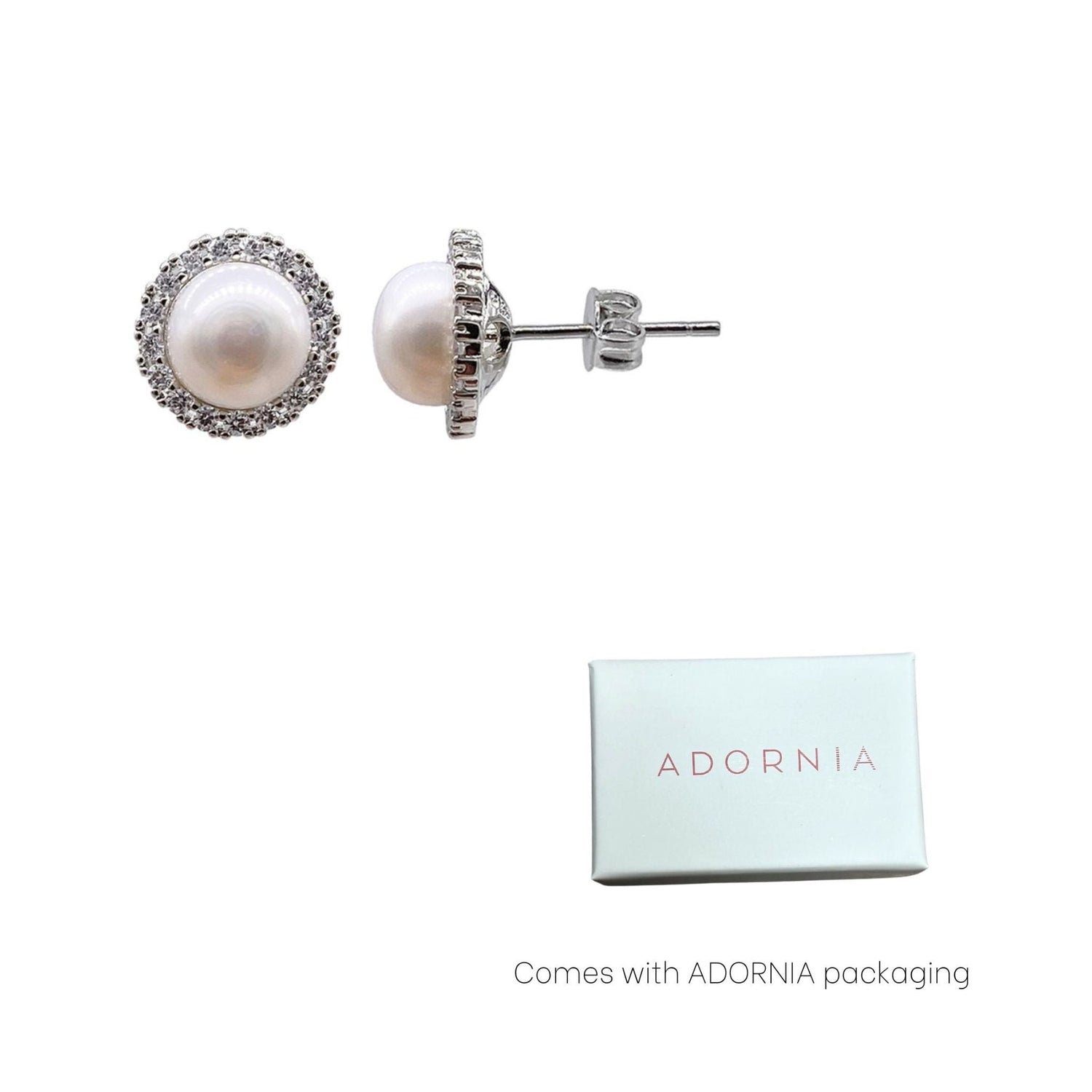 These Freshwater Pearl Halo Earrings by Adornia exude timeless beauty. A luminous 8mm freshwater pearl is encircled by a sparkling halo of Swarovski crystals, creating a refined and radiant stud design. Their versatile elegance makes them a perfect addition to both casual and formal ensembles.