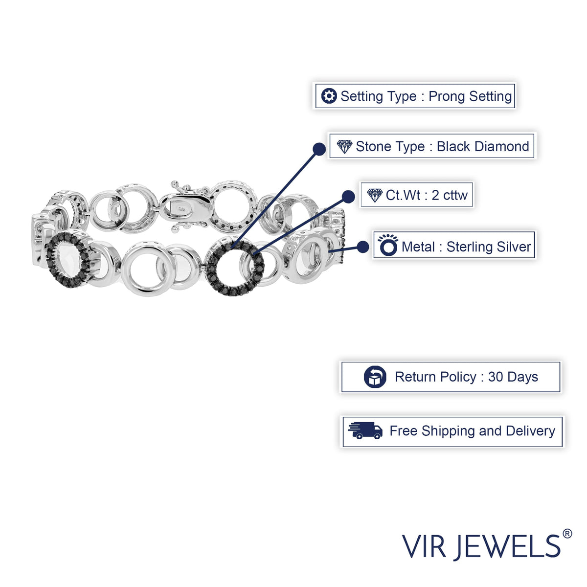 This Black Diamond Tennis Bracelet by Vir Jewels is a bold and sophisticated statement piece. Crafted in .925 sterling silver with rhodium plating, this circle-link design features 60 natural round black diamonds, totaling 2 cttw. The deep black hue contrasts beautifully against the silver setting, making it an elegant choice for any occasion.