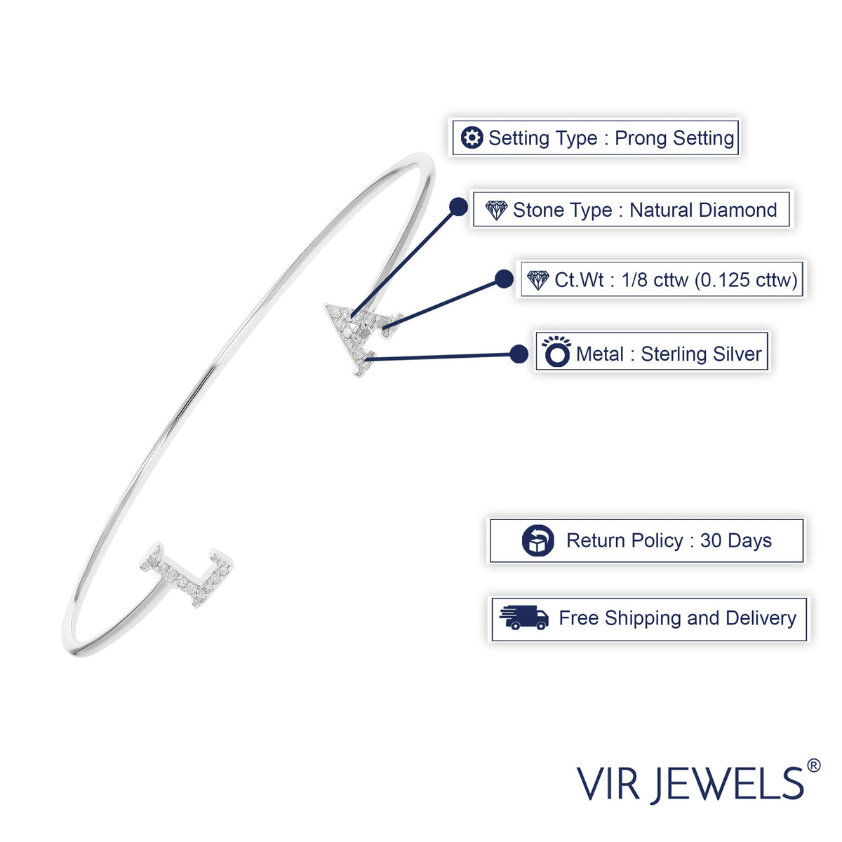 This Los Angeles Diamond Bangle Bracelet by Vir Jewels embodies effortless sophistication. Featuring 21 natural round diamonds totaling 1/8 cttw, this .925 sterling silver bangle with rhodium plating is a delicate yet eye-catching piece. Its sleek design makes it ideal for everyday wear or layering.