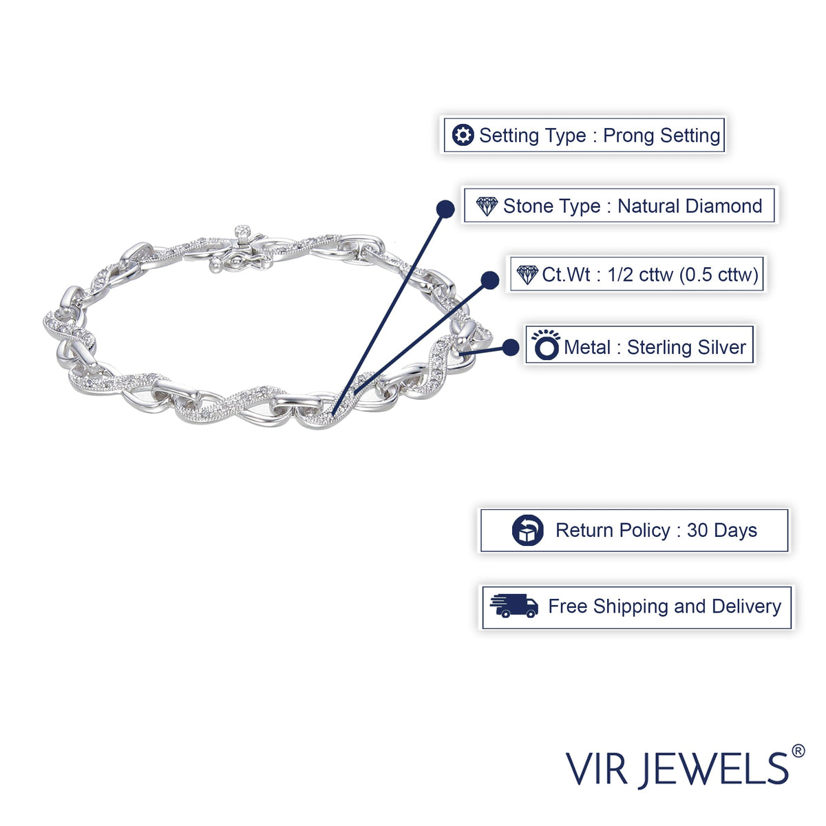 This Diamond Infinity Tennis Bracelet by Vir Jewels adds a timeless sparkle to any collection. Designed in .925 sterling silver with rhodium plating, it showcases 40 natural round diamonds totaling 1/2 cttw. The infinity-inspired design offers a contemporary yet classic aesthetic.