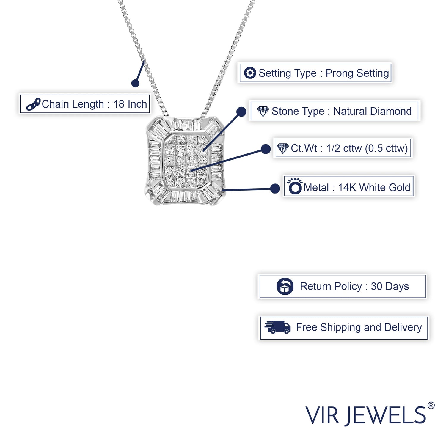Handcrafted in 14K white gold with 36 natural princess and baguette-cut diamonds. Total diamond weight: 1/2 cttw. Diamonds are securely held in a prong setting. Pendant measures approximately 0.33 inches in length and 0.33 inches in width. Suspended from an 18-inch chain. April birthstone.