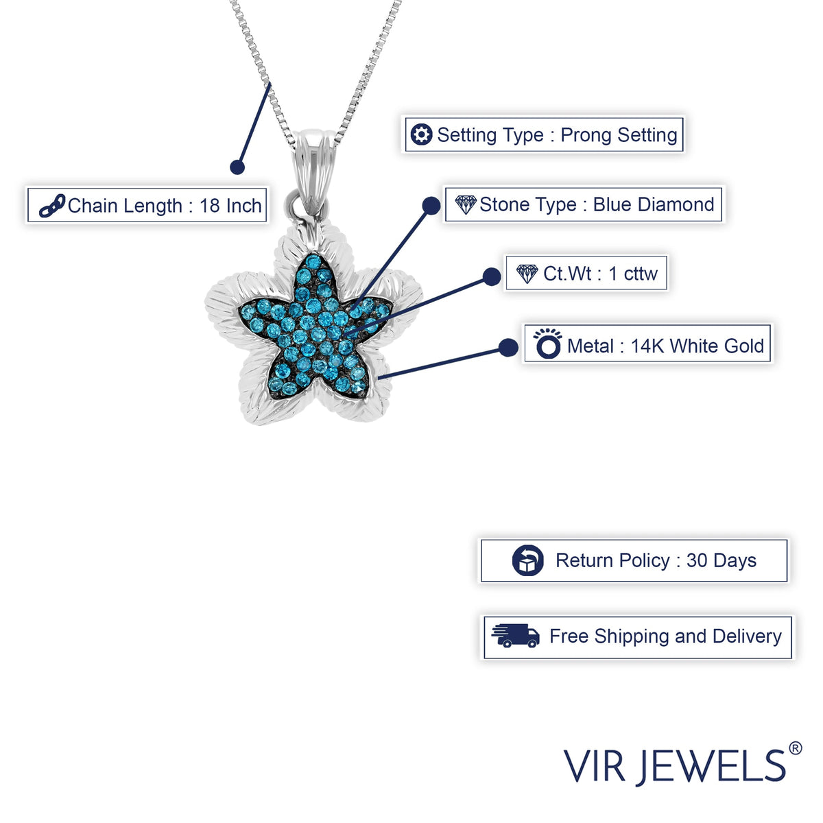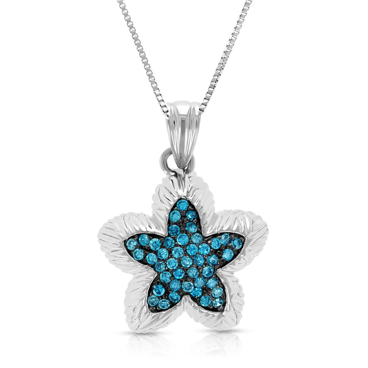 1 cttw Blue Diamond Starfish Pendant Necklace 14K White Gold with 18 Inch Chain