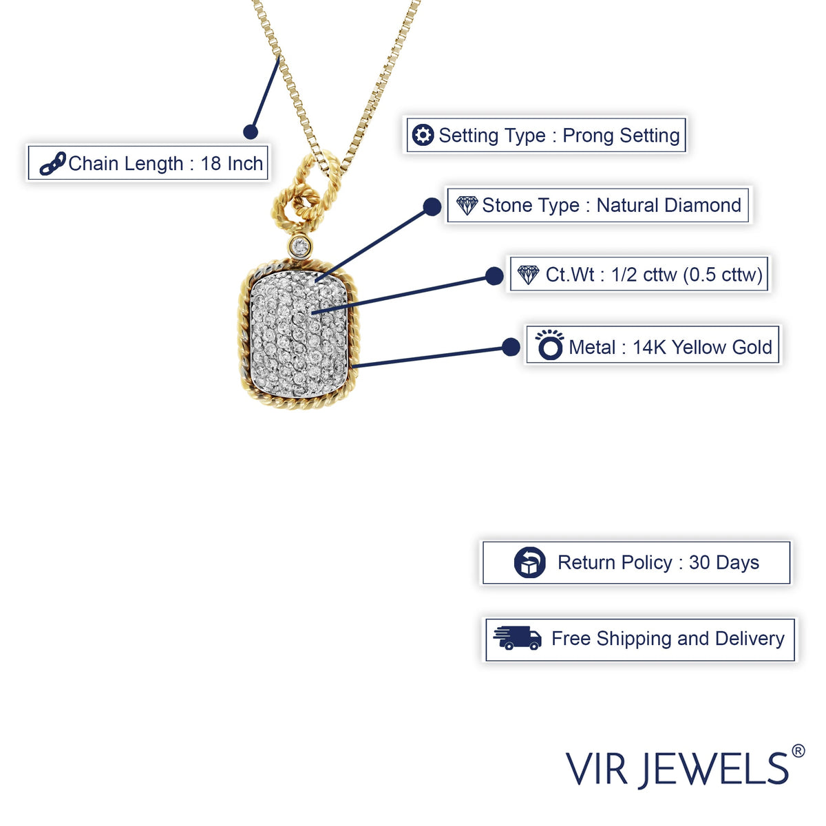 Handcrafted in 14K yellow gold with 60 natural round diamonds. Total diamond weight: 1/2 cttw. Diamonds are set in a secure prong setting. Pendant measures approximately 1 inch in length and 0.5 inches in width. Suspended from a cable chain. April birthstone.