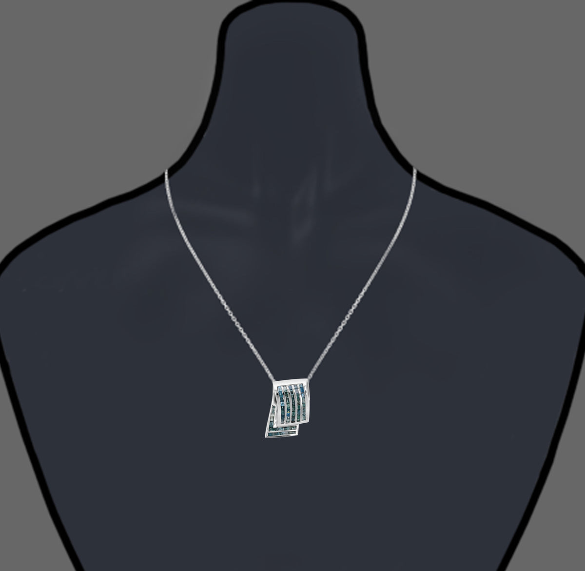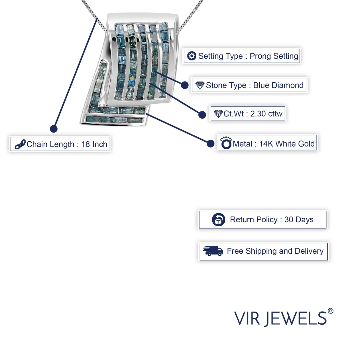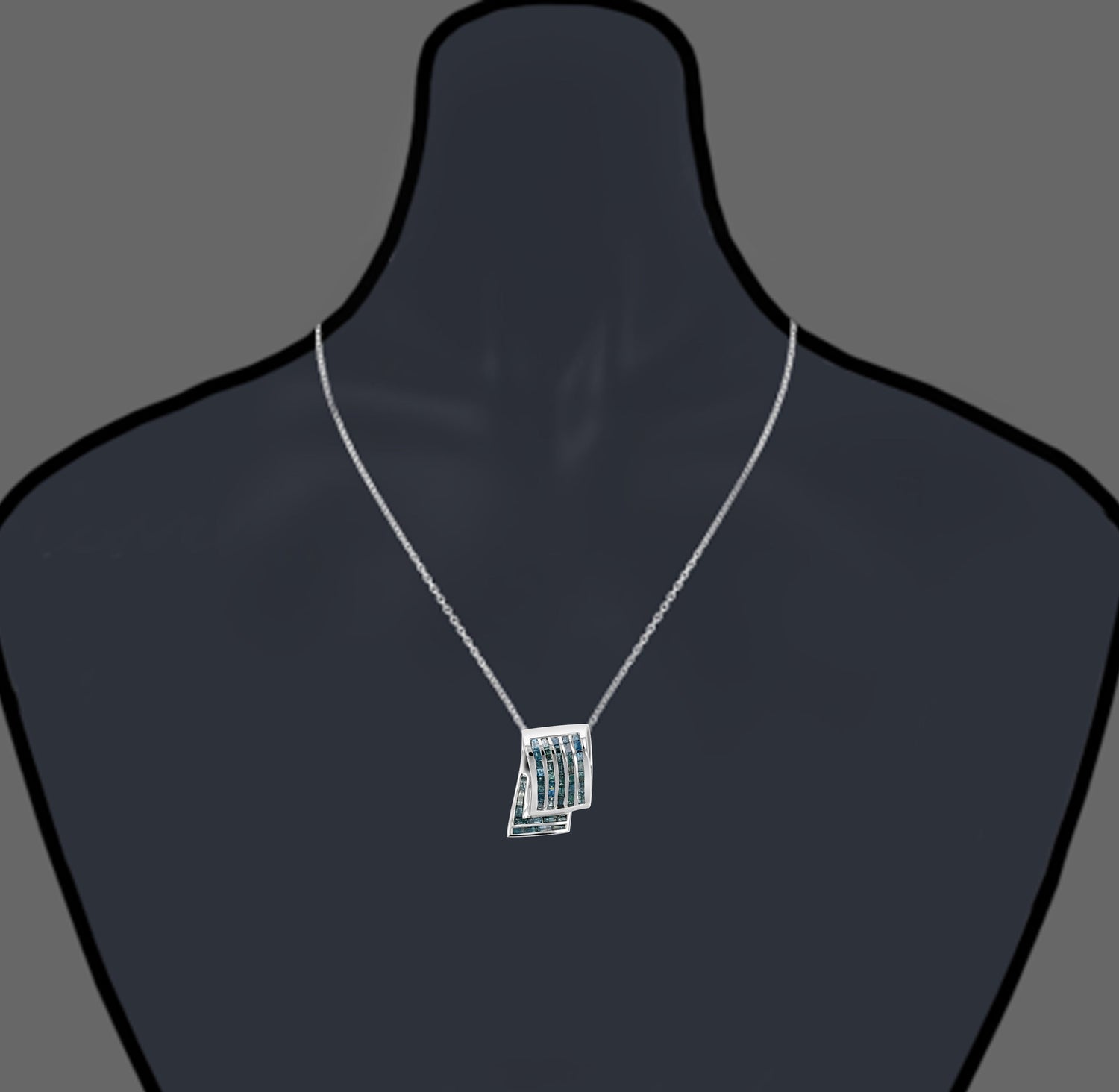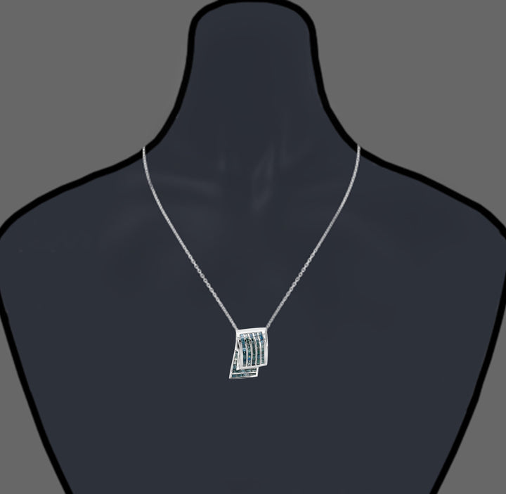 Handcrafted in 14K white gold with 47 natural blue baguette-cut diamonds. Total diamond weight: 2.30 cttw. Diamonds are securely set in a channel setting. Pendant measures approximately 1 inch in length and 0.66 inches in width. Suspended from an 18-inch chain. April birthstone. Blue diamonds are treated by irradiation to enhance their color.