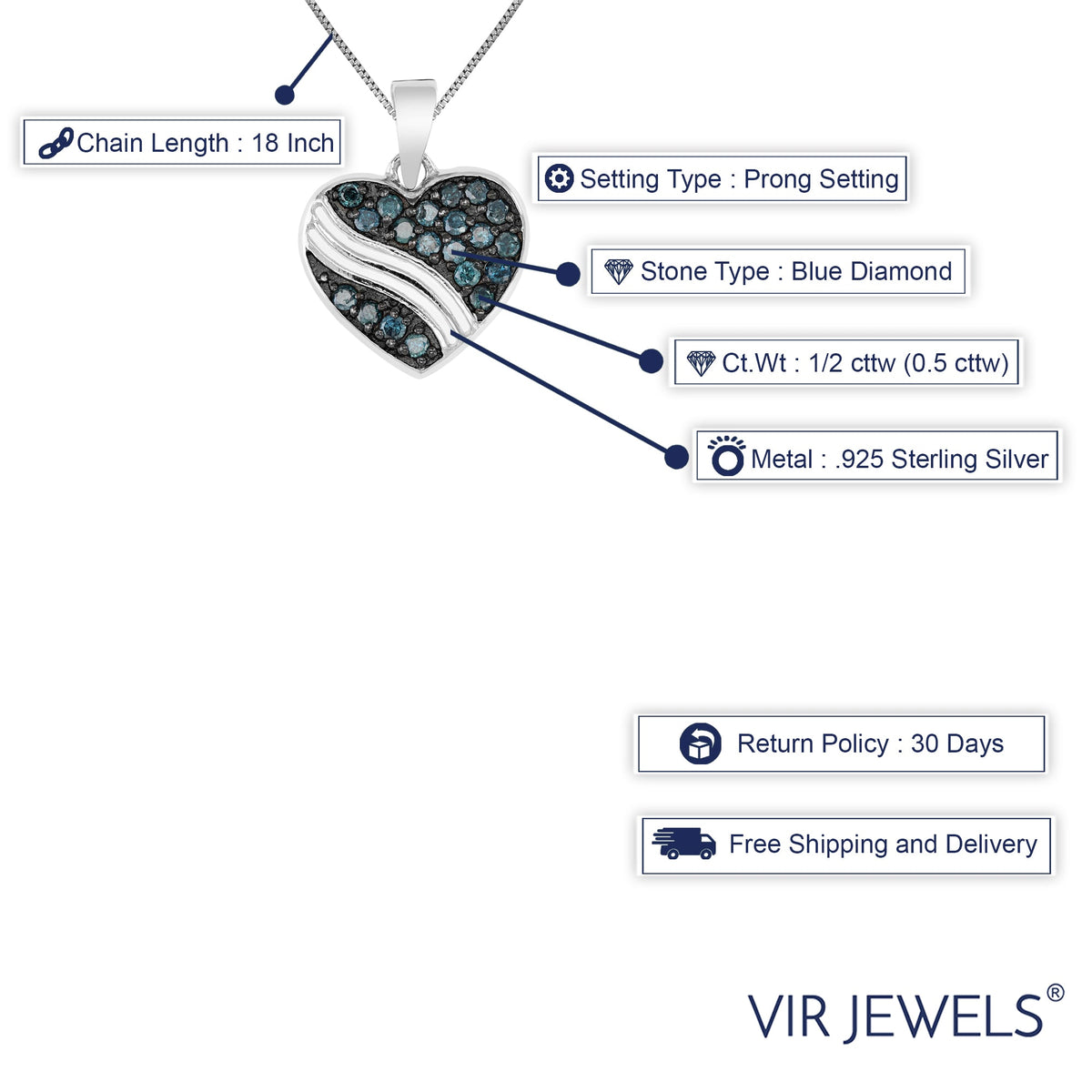 This Blue Diamond Heart Pendant Necklace by Vir Jewels is a romantic and vibrant expression of love. Crafted in .925 sterling silver, the pendant features a heart silhouette adorned with 20 round blue diamonds in a secure prong setting. The striking blue diamonds create a captivating contrast against the sterling silver, making this 1/2 cttw pendant a charming and elegant addition to any jewelry collection. Measuring approximately 0.79 inches in length, it is perfect for everyday wear or gifting.