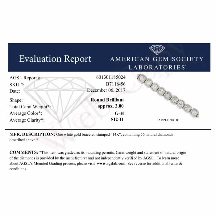 Handcrafted in 14K white gold with 51 natural round diamonds. Total diamond weight: 2 cttw. Clarity: SI2-I1. Color: I-J. Diamonds are set in a bezel setting with milgrain detailing. Bracelet length: 7 inches. Secured with a box and tongue safety clasp. April birthstone.