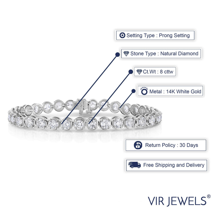 This Certified 8 cttw Diamond Tennis Bracelet by Vir Jewels is a breathtaking statement of luxury and refinement. Featuring 29 dazzling round diamonds in a secure prong setting, this bracelet captures light from every angle. The natural diamonds exhibit a K-L color grade with I1-I2 clarity, set in radiant 14K white gold. Measuring 7 inches in length, this bracelet is secured with a box and tongue safety clasp for a seamless fit.