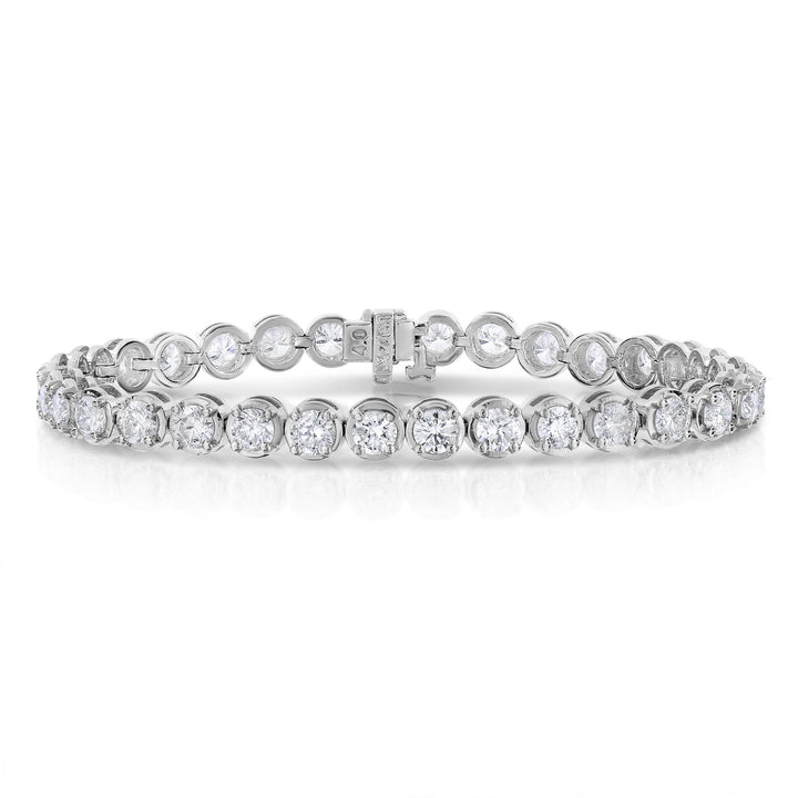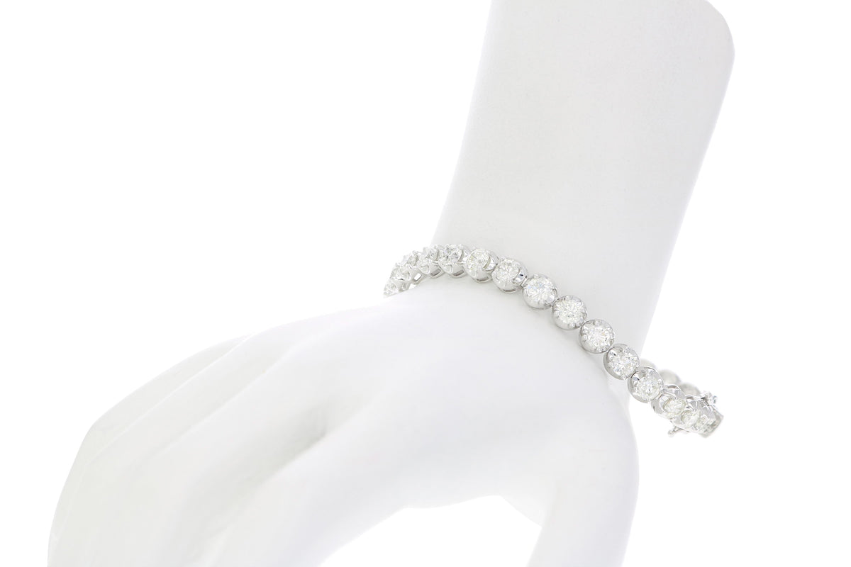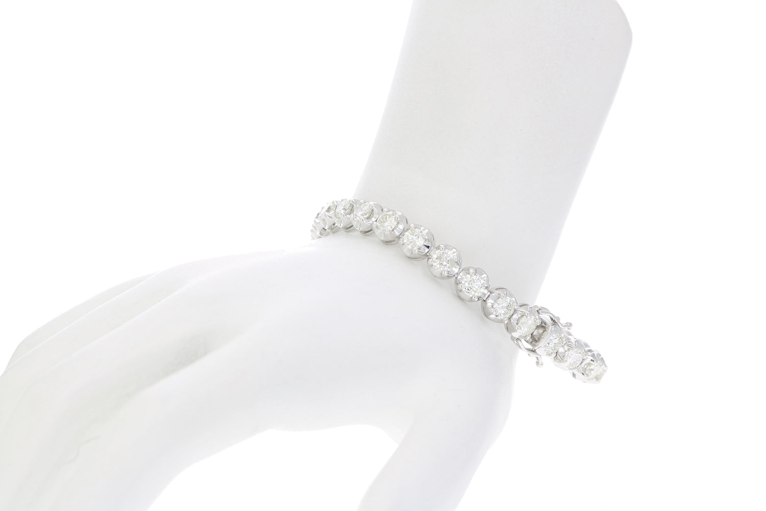 Handcrafted in 14K white gold with 29 natural round diamonds. Total diamond weight: 8 cttw. Clarity: I1-I2. Color: K-L. Diamonds are set in a prong setting. Bracelet length: 7 inches. Secured with a box and tongue safety clasp. Certified for authenticity. April birthstone.