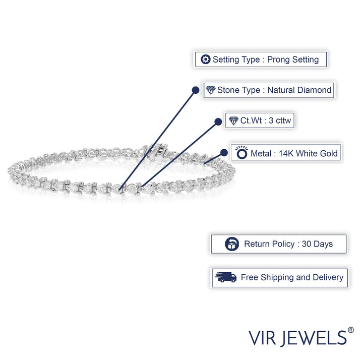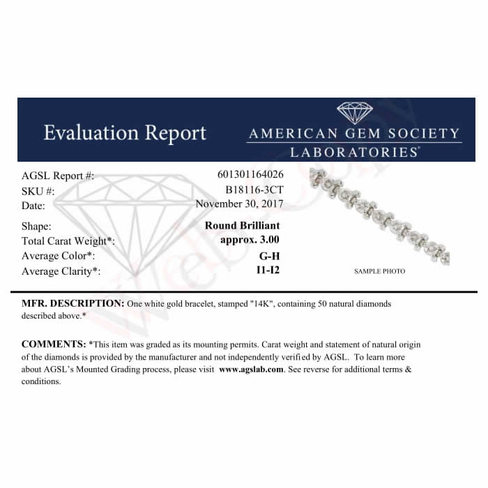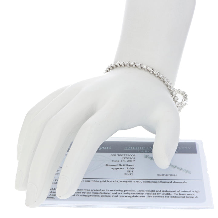 3 cttw I1-I2 Certified Diamond Bracelet 14K White Gold G-H 3 Prong Round 7 Inch