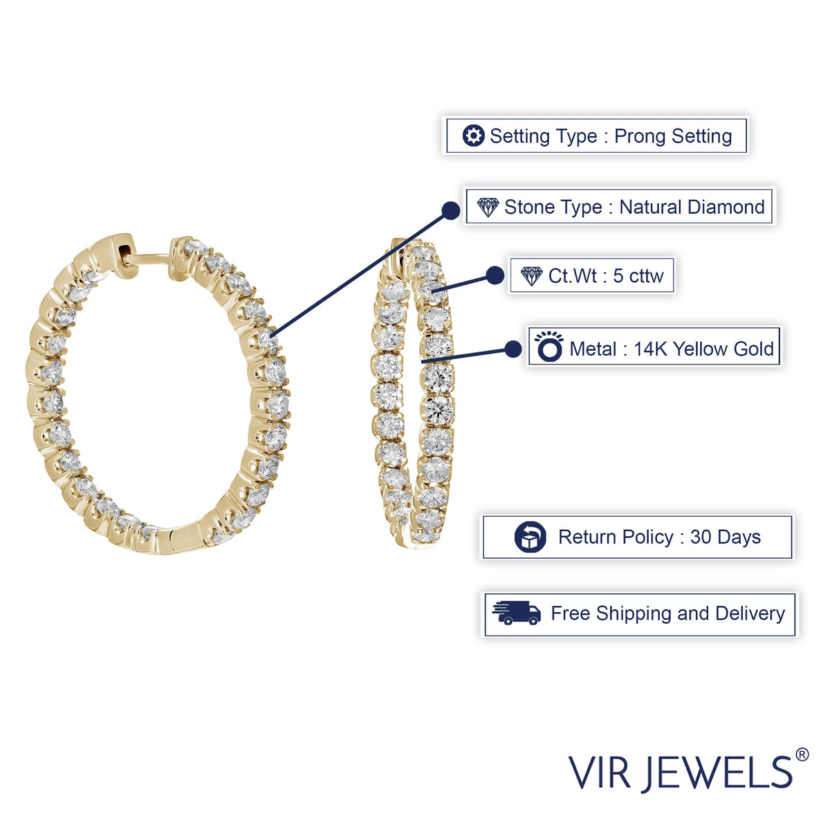 These 5 cttw Diamond Inside-Out Hoop Earrings by Vir Jewels radiate luxury and brilliance. Set in 14K yellow gold, these hoops feature 48 round diamonds adorning both the inner and outer edges, maximizing sparkle from every angle. The warm glow of yellow gold enhances the I-J color diamonds, making these hoops a statement piece for any occasion. Measuring approximately 1.38 inches in height, they are secured with hidden snap posts for a seamless look.