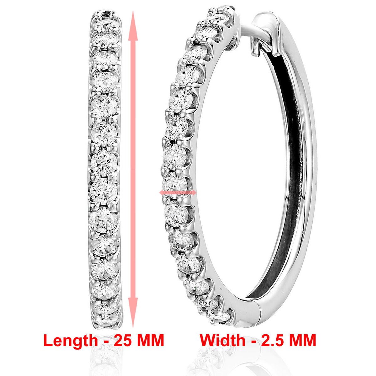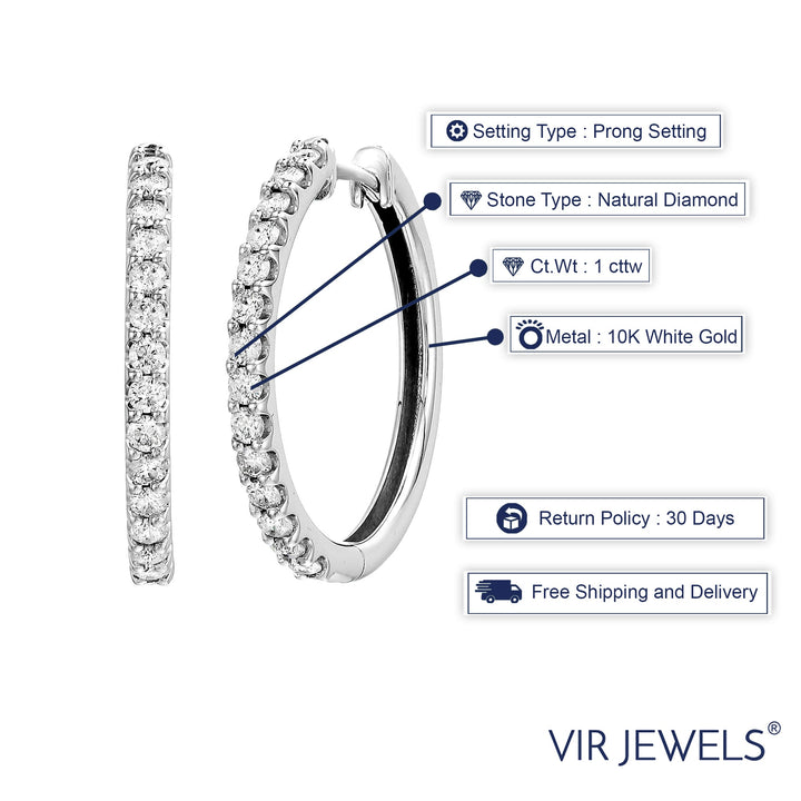 1 cttw Diamond Hoop Earrings 10K White Gold Round Prong Set 1 Inch