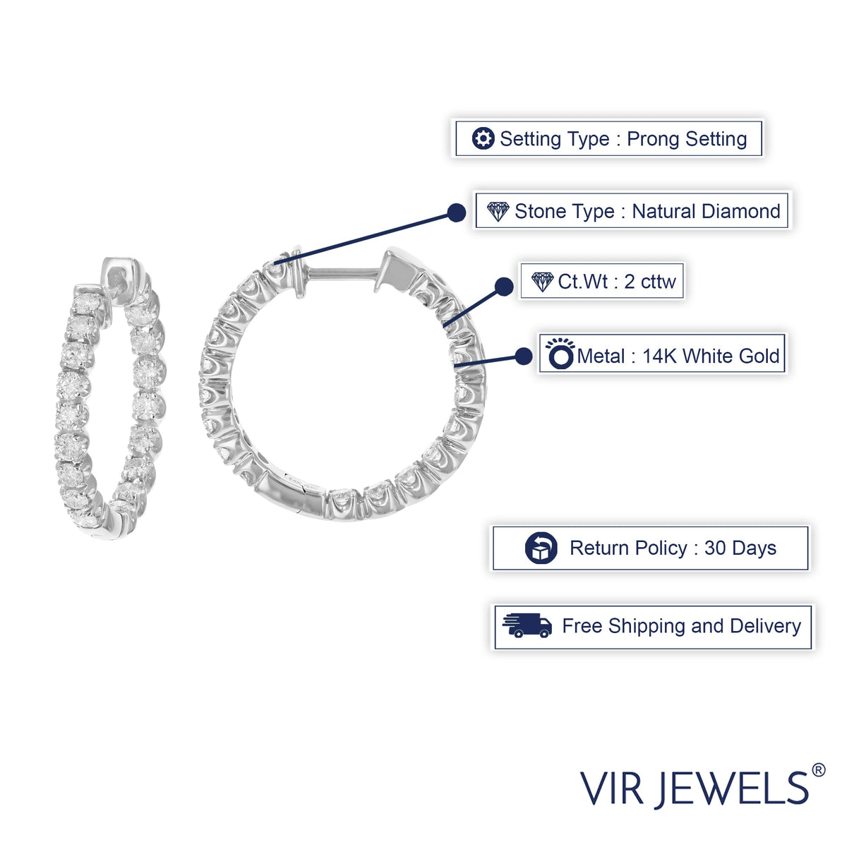 These Certified 2 cttw Diamond Inside-Out Hoop Earrings by Vir Jewels are a dazzling expression of sophistication. Featuring 36 round diamonds set in 14K white gold, these hoops offer an elegant sparkle from every angle. The SI2-I1 clarity and G-H color diamonds ensure exceptional brilliance, while the prong setting enhances their radiance. Measuring 1 inch in height, they are perfect for adding a refined touch to any look.