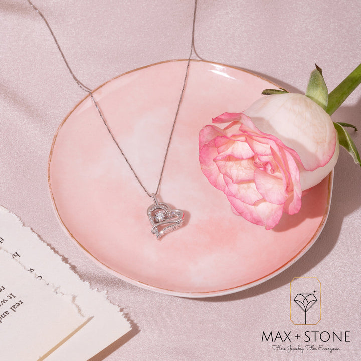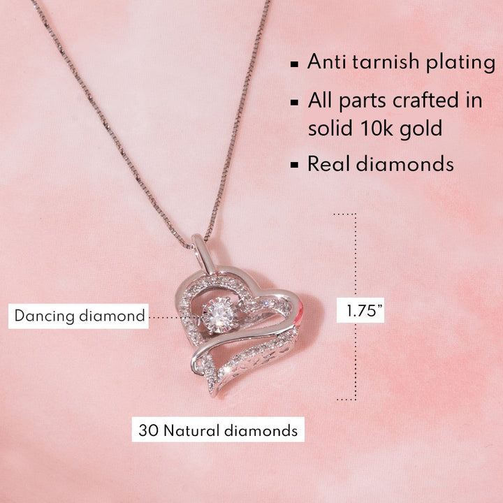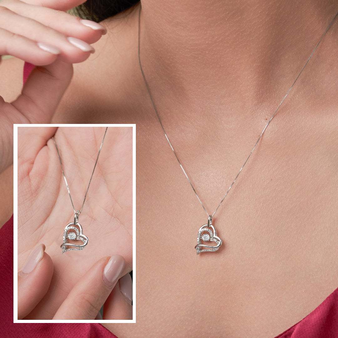 This Golden Glimmer Dancing Diamond Heart Pendant Necklace by MaxColor is a radiant expression of love and elegance. Featuring 30 hand-set natural diamonds in a delicate heart-shaped design, the pendant’s unique 'Dancing Diamond' setting allows the stones to shimmer with every movement. A timeless and meaningful addition to any collection.