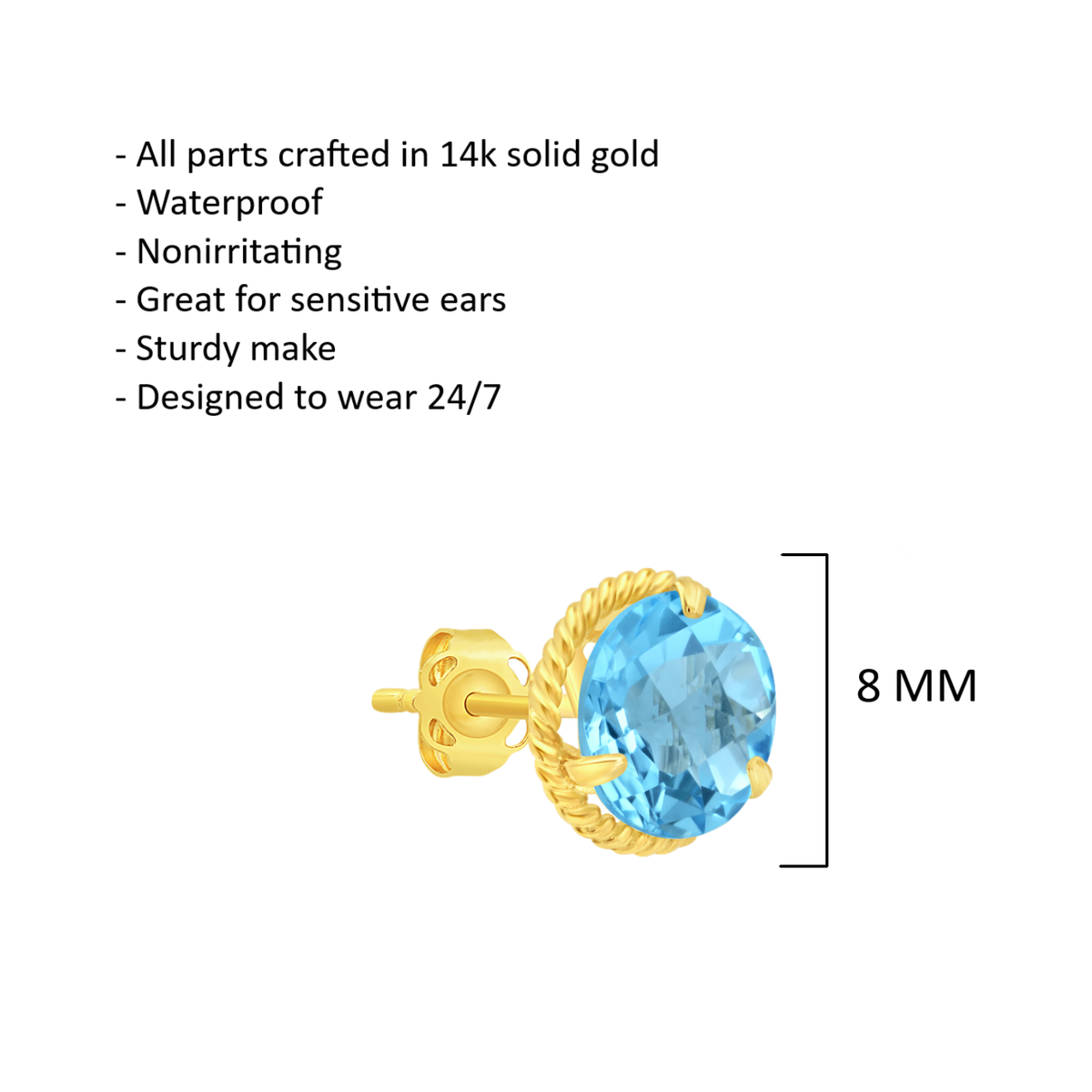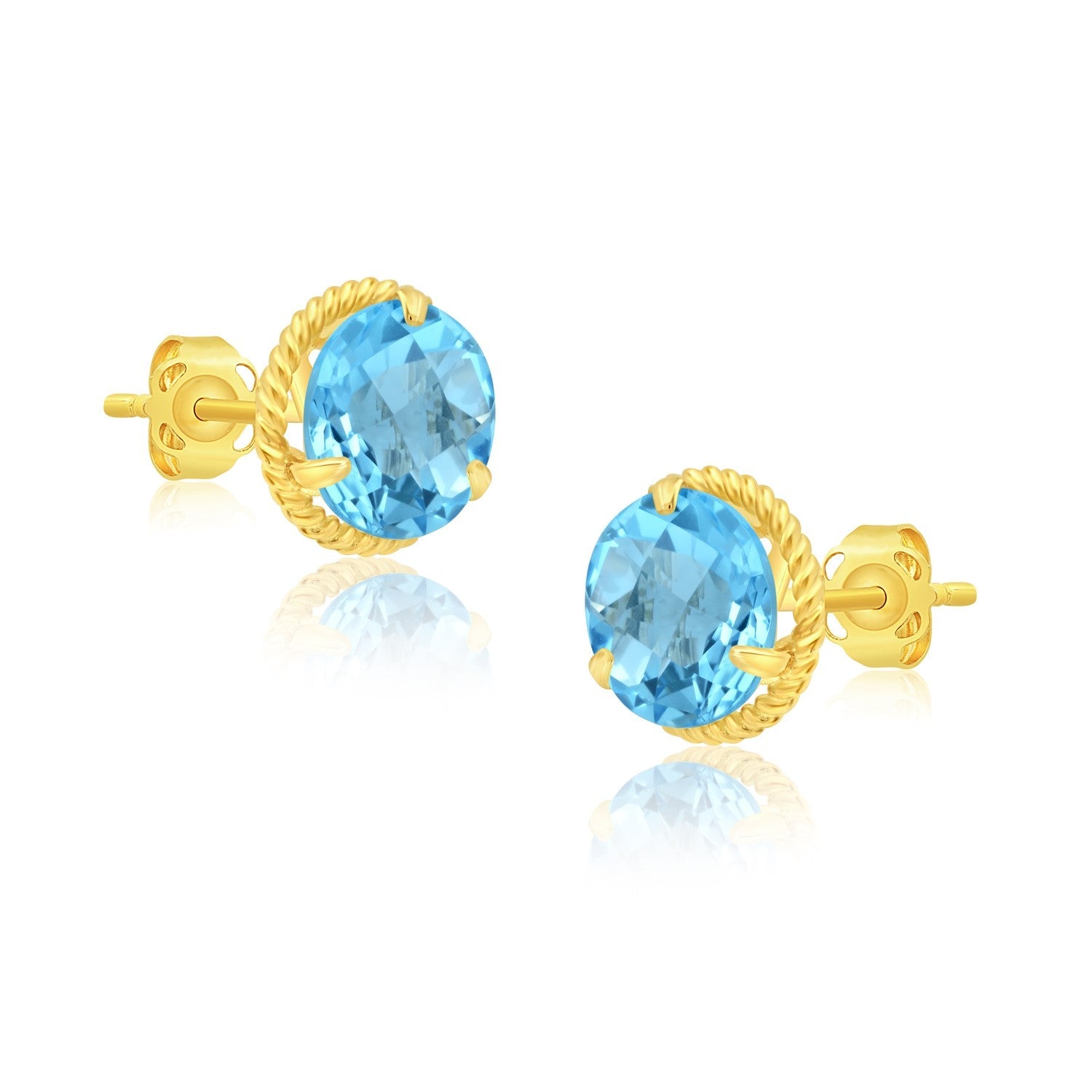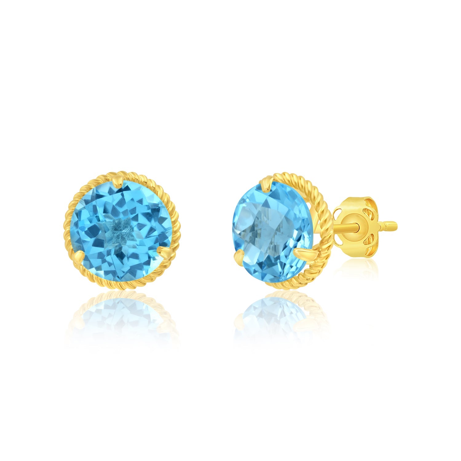 Handcrafted in 14k yellow gold. Set with a pair of round-cut gemstones, each measuring 8mm. Encircled by a roped halo for enhanced brilliance. Secure post and back closure.
