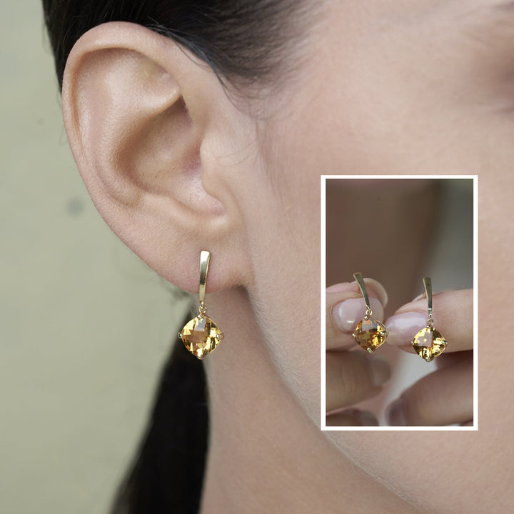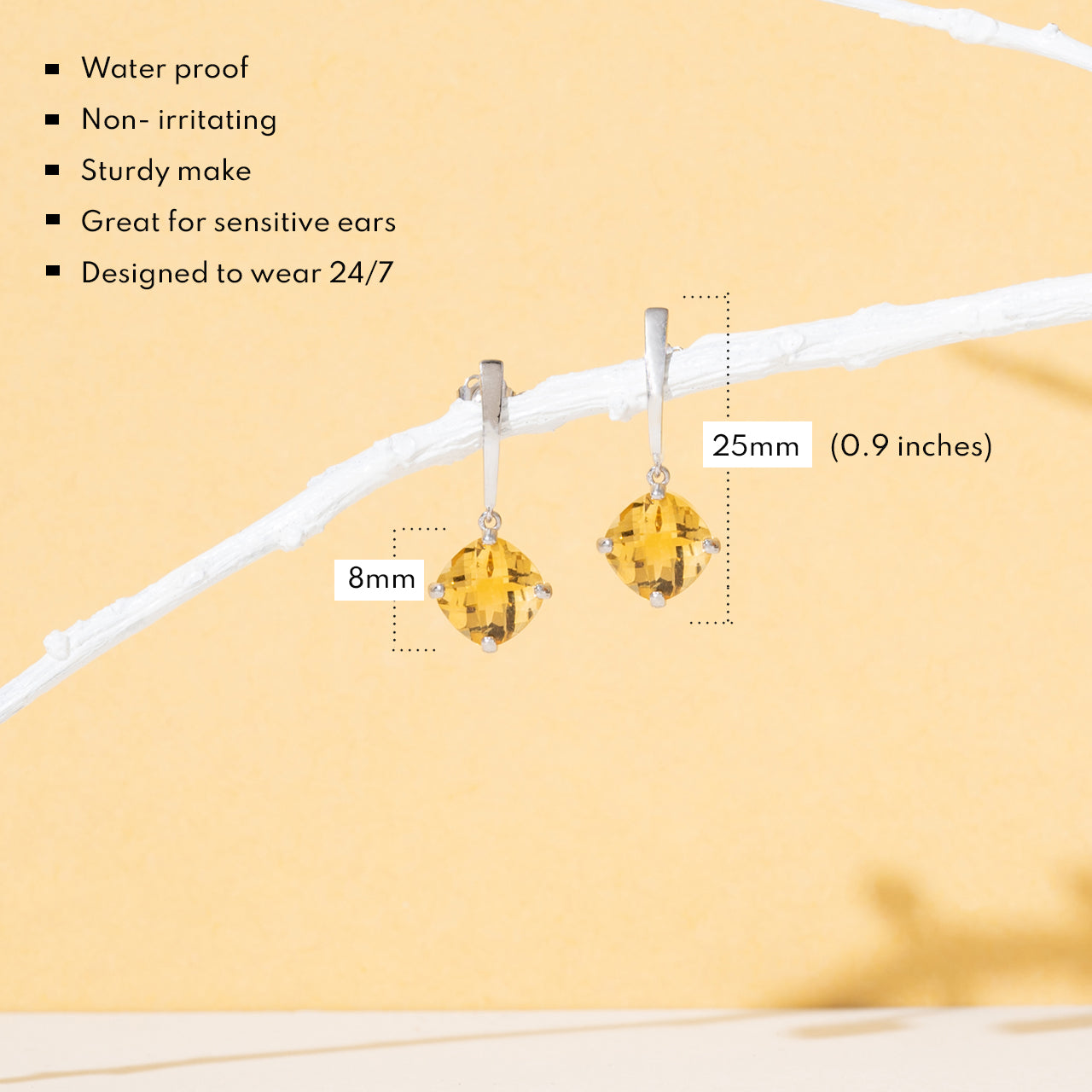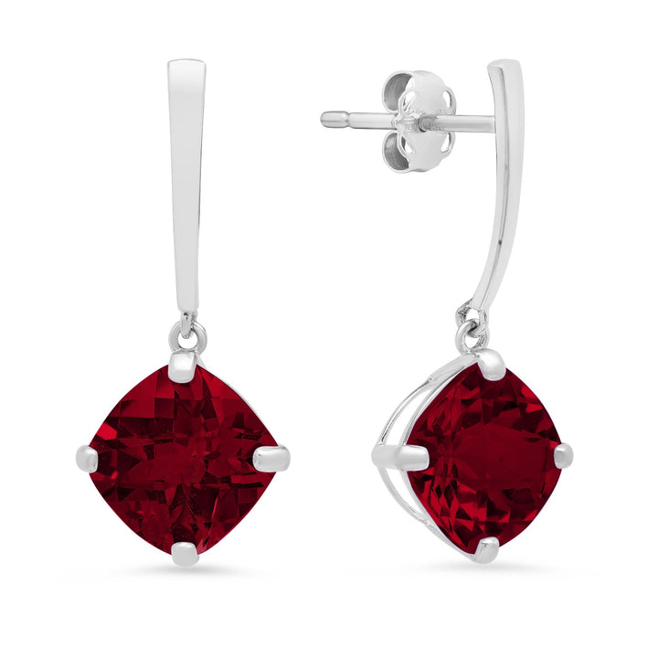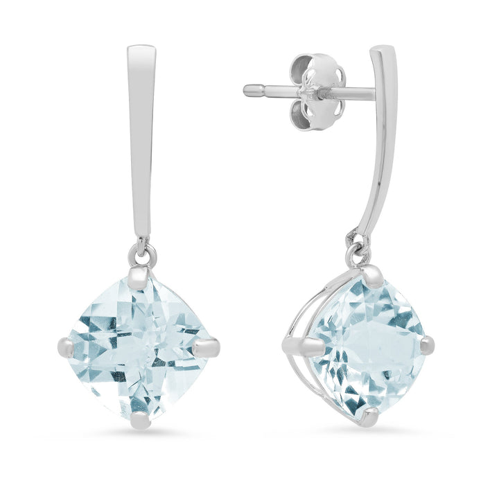 Handcrafted in 14k white gold. Set with a pair of cushion-cut gemstones, each measuring 8mm. Secure drop setting with premium posts and backs.