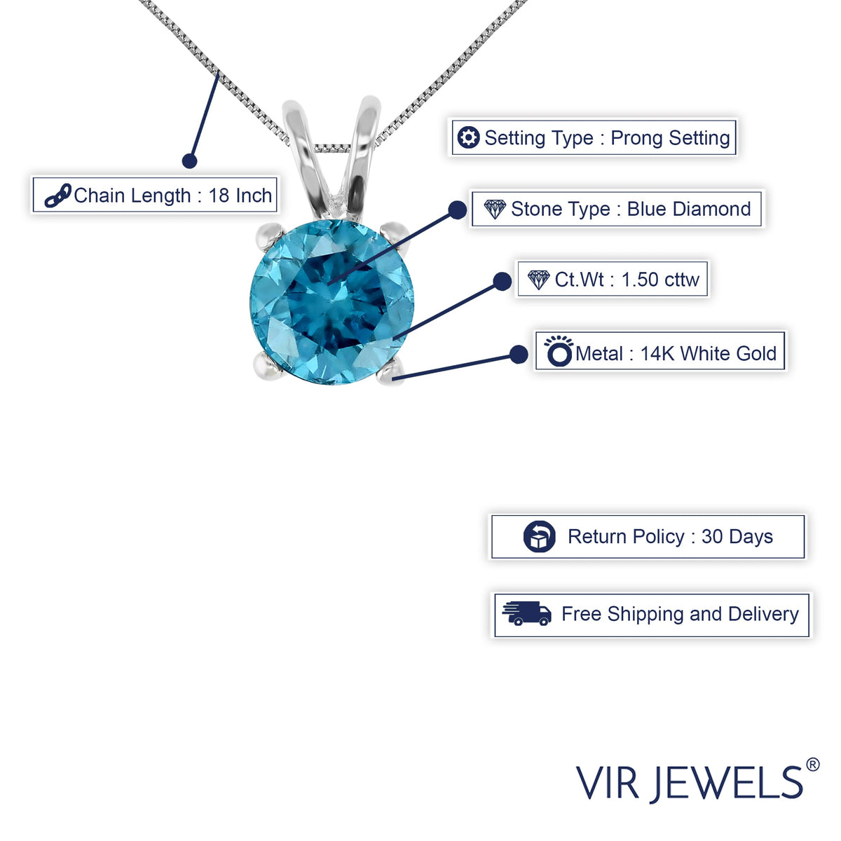 Crafted in 14k white gold. Set with a 1.50 carat (1.50 ct.tw.) natural round blue diamond, treated with permanent irradiation for color enhancement. Prong setting for maximum sparkle. Pendant measures approximately 0.26 inches in length and width. Includes an 18-inch .925 sterling silver chain. Comes with a jewelry gift box.