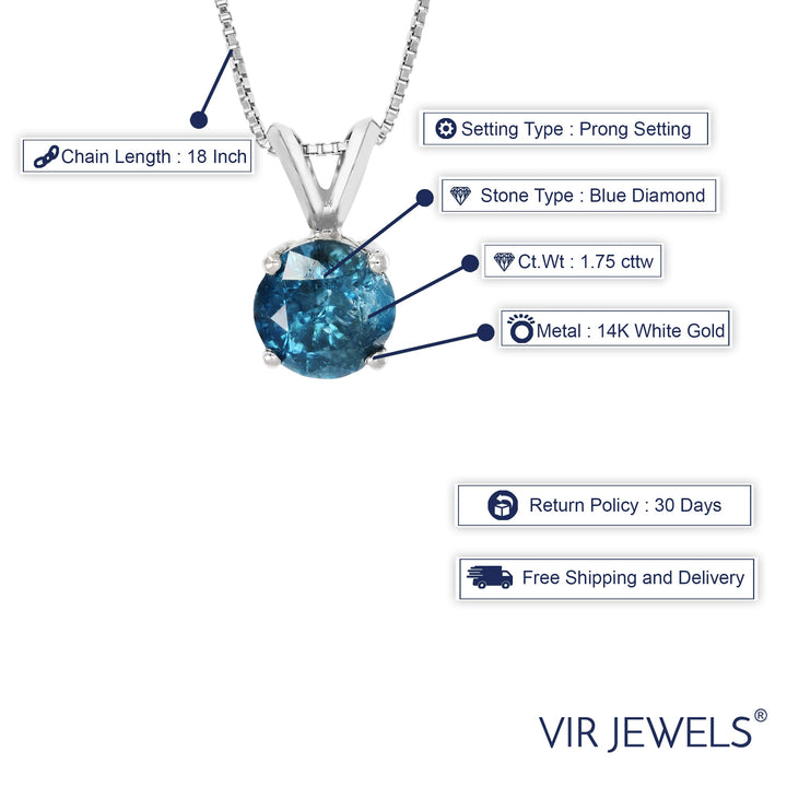 1.75 cttw Blue Diamond Solitaire Pendant Necklace 14K White Gold Round and Chain