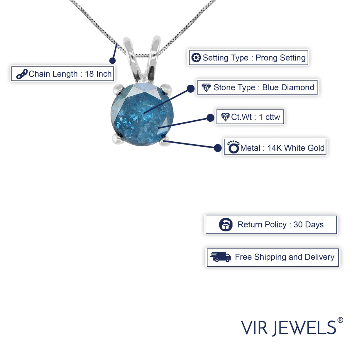 Crafted in 14k white gold. Set with a 1.0 carat (1.0 ct.tw.) natural round blue diamond, treated with permanent irradiation for color enhancement. Prong setting for brilliance. Pendant measures approximately 0.23 inches in length and width. Includes an 18-inch .925 sterling silver chain. Comes with a jewelry gift box.