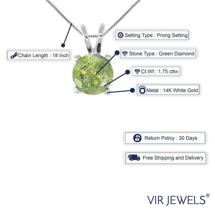1.75 cttw Green Diamond Solitaire Pendant 14K White Gold Round with Chain