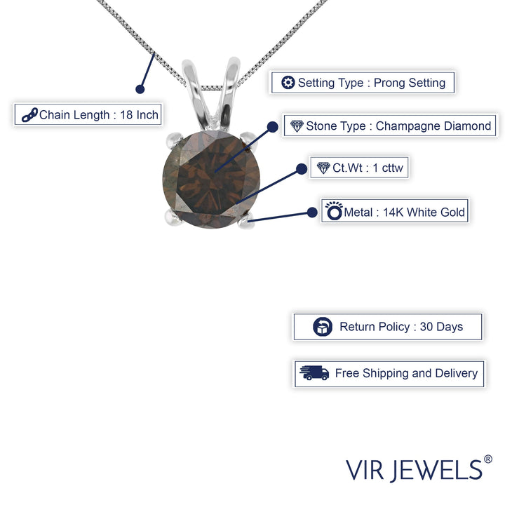 1 cttw Champagne Diamond Solitaire Pendant 14K White Gold Round with Chain