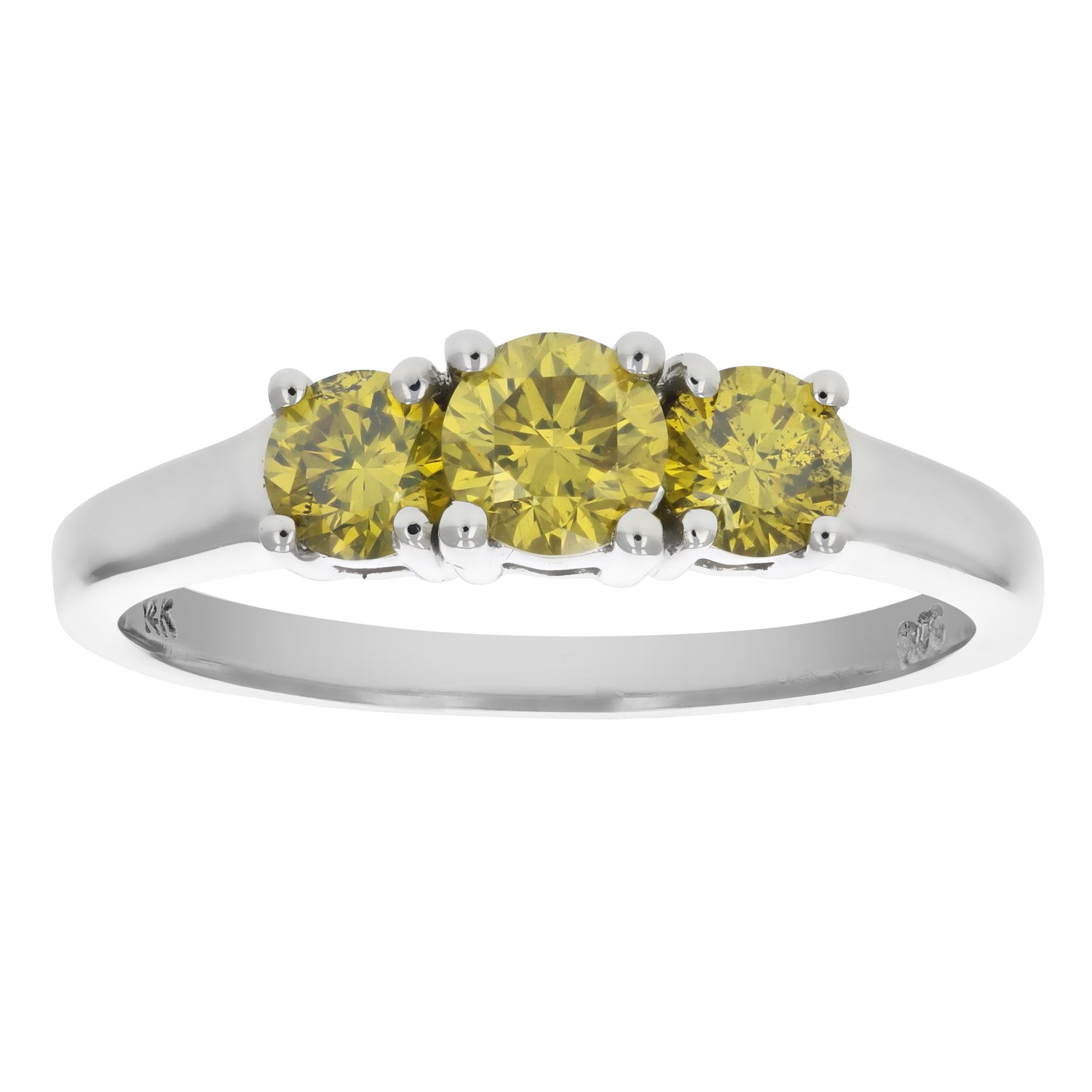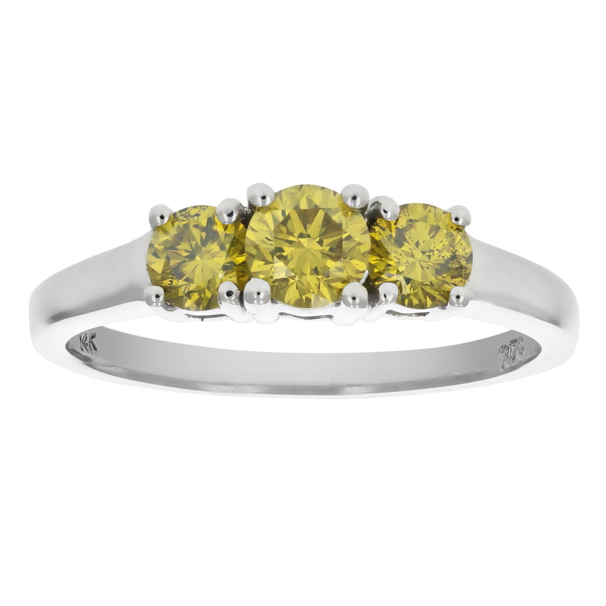 Crafted in 14k white gold. Set with three natural round yellow diamonds totaling 1.0 carat (I1-I2 clarity). Prong setting for brilliance. Yellow diamonds are permanently treated by irradiation for color enhancement. Comes with a jewelry gift box.