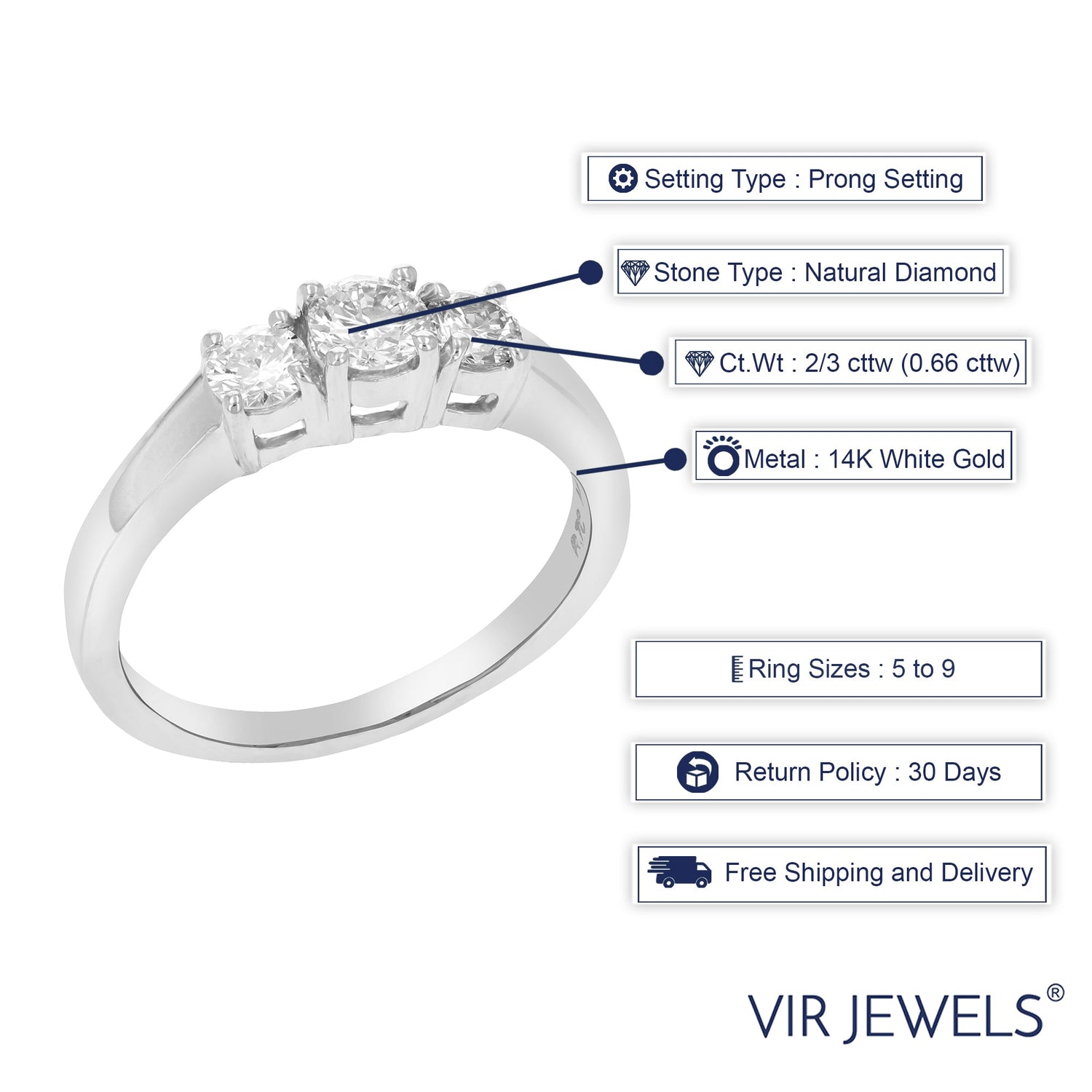 This Certified 2/3 cttw 3 Stone Diamond Engagement Ring by Vir Jewels is a timeless symbol of love and commitment. Featuring three radiant diamonds in a classic prong setting, this ring captures elegance and sophistication. The 14k white gold band enhances the brilliance of the diamonds, making it a stunning choice for an engagement.