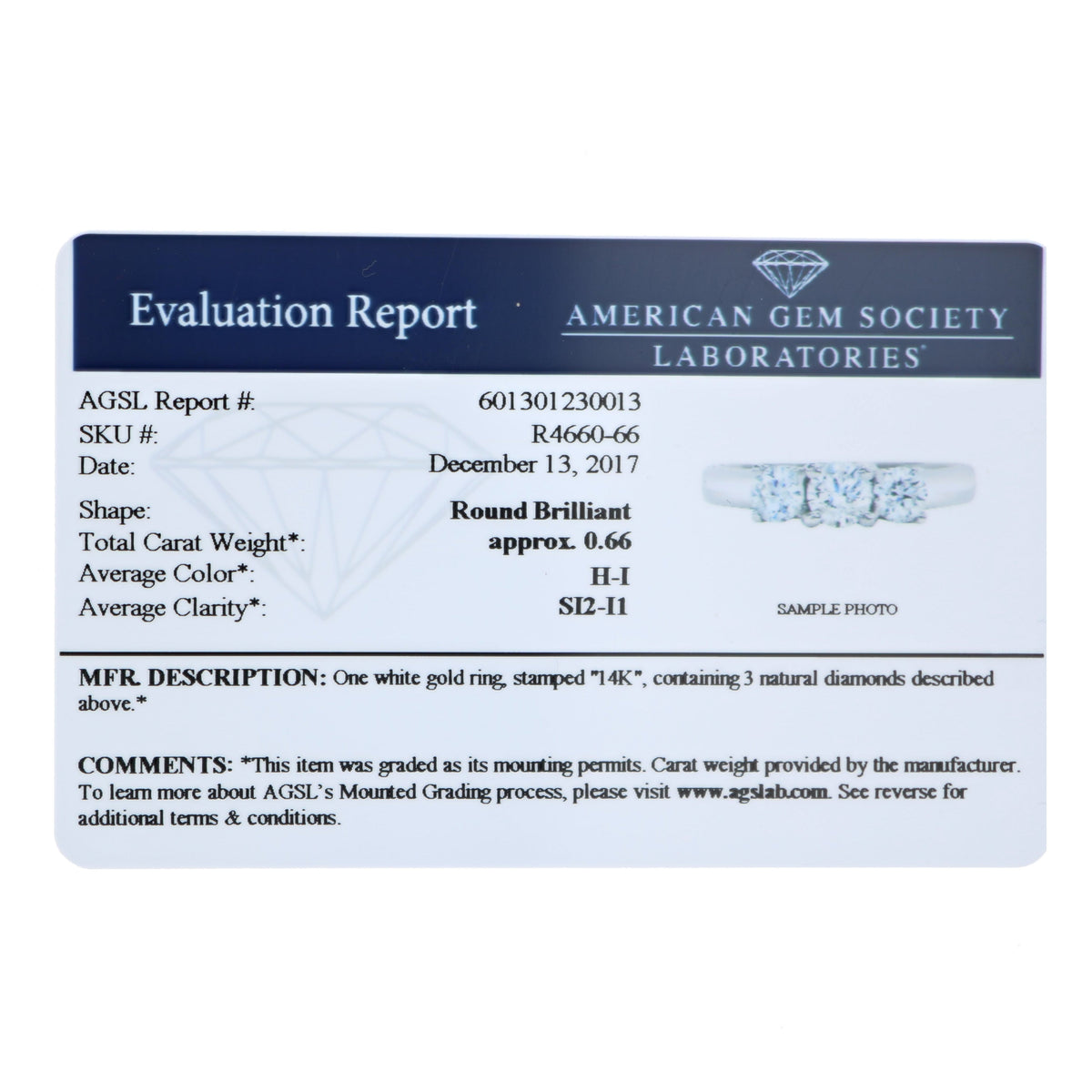 Crafted in 14k white gold. Set with three natural round diamonds totaling 0.66 carats (SI2-I1 clarity, I-J color). Prong setting for brilliance. AGS certified with a unique identification number. Includes a certification card and a jewelry gift box.
