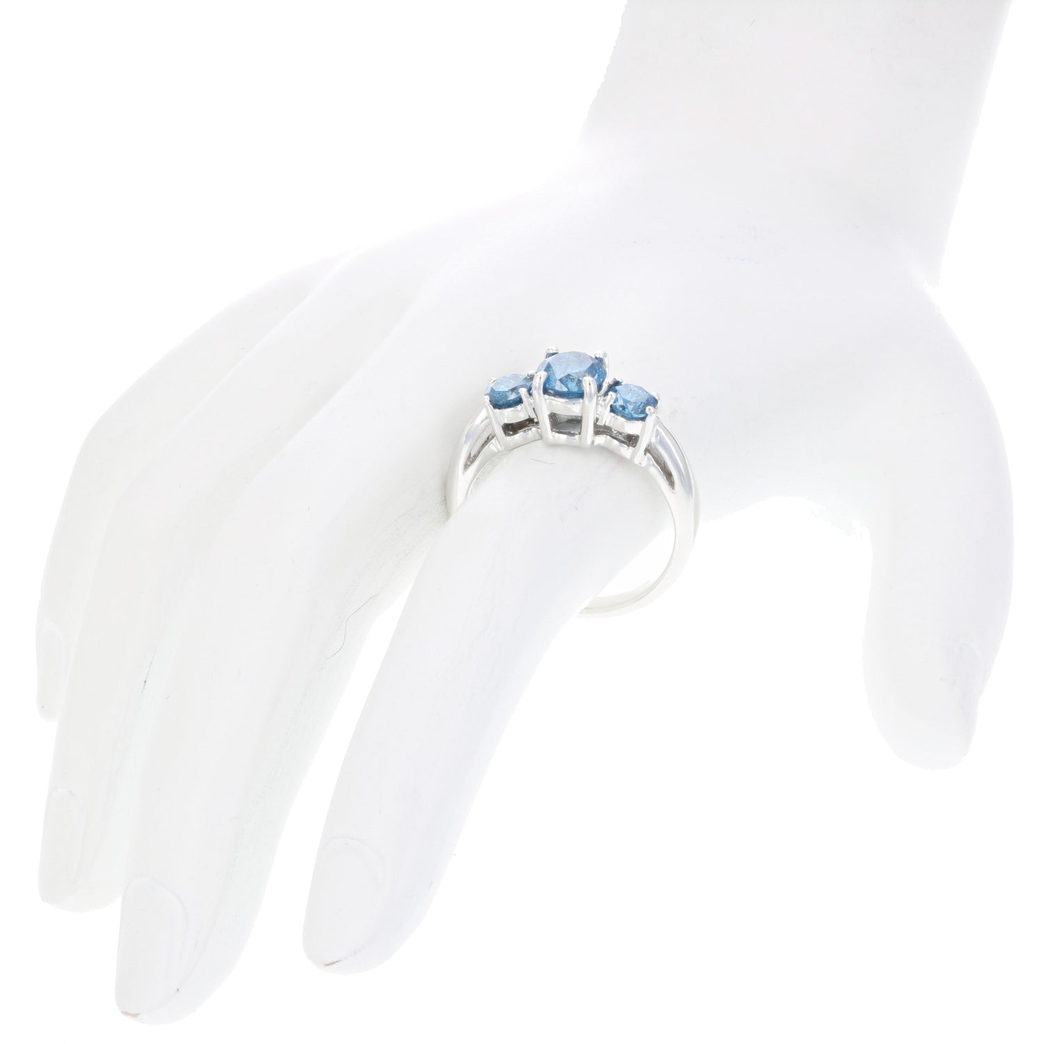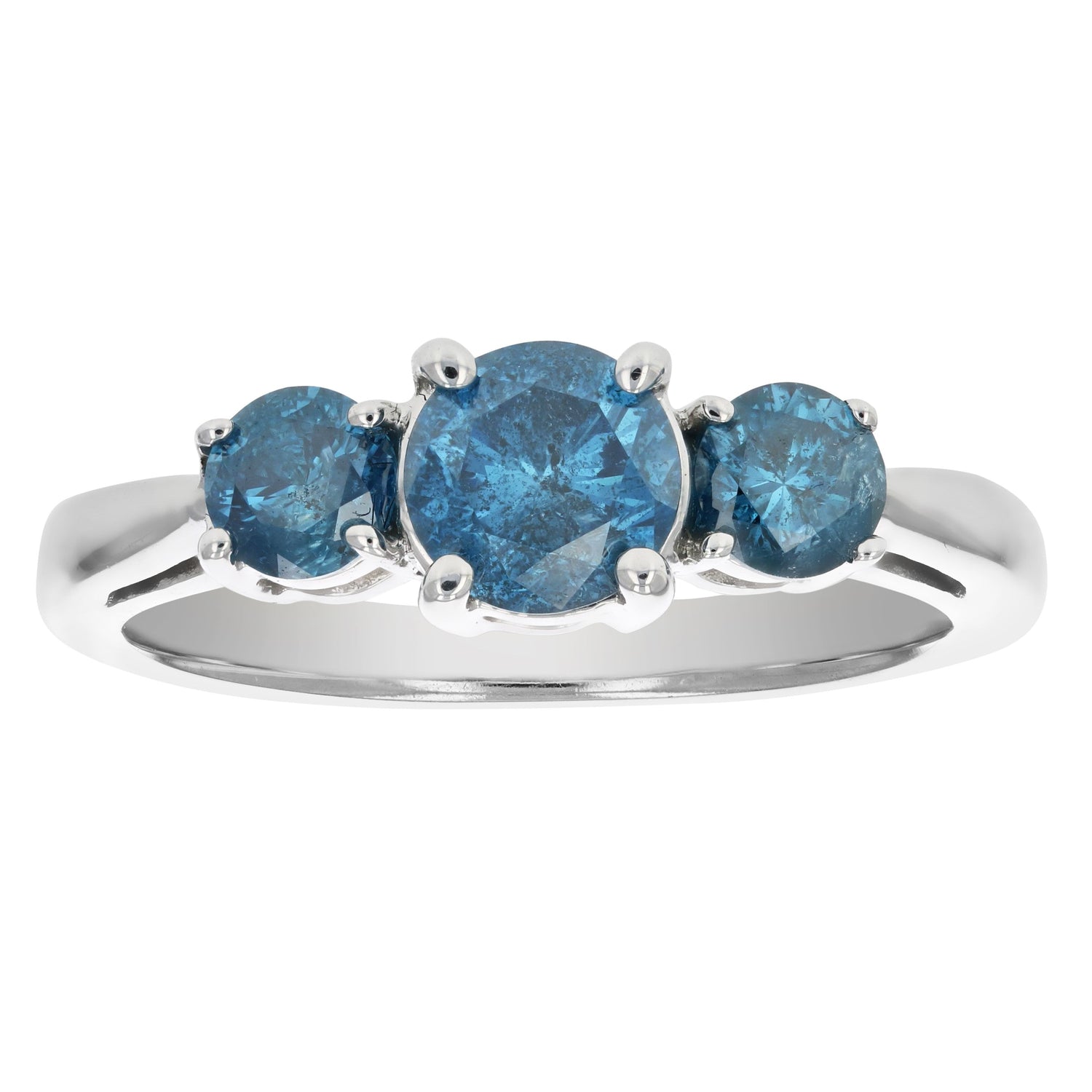 Crafted in 14k white gold. Set with three natural round blue diamonds totaling 1.50 carats (I1-I2 clarity). Prong setting for brilliance. Blue diamonds are permanently treated by irradiation for color enhancement. Comes with a jewelry gift box.
