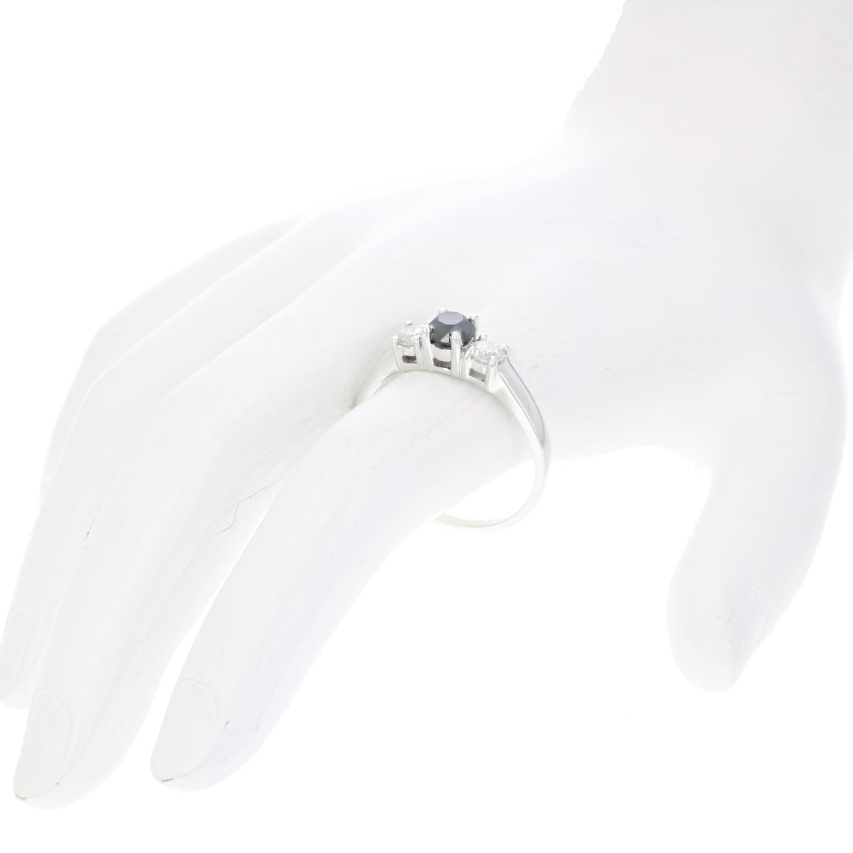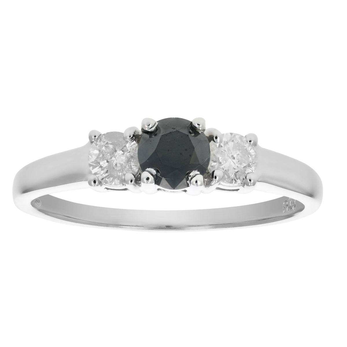 Handcrafted in 14K white gold. Features three natural round diamonds totaling 1 cttw. Black diamonds (0.40 cttw) are heat-treated for enhanced color. White diamonds (0.60 cttw) have an I-J color grade and I1-I2 clarity. Prong setting ensures secure placement. April birthstone.