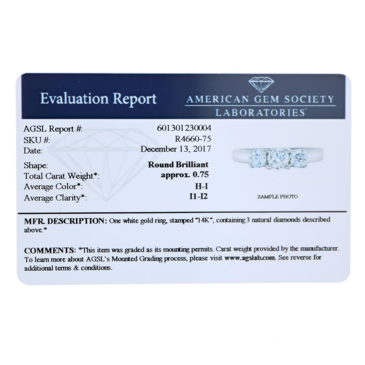 Handcrafted in 14K white gold. Features three natural round diamonds totaling 0.75 cttw. Diamonds have an I-J color grade and I1-I2 clarity. AGS certified with a unique identification number. Prong setting ensures secure placement. April birthstone.