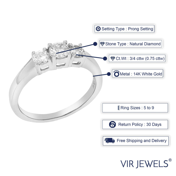 This 3/4 cttw Certified 3 Stone Diamond Engagement Ring by Vir Jewels is a refined and timeless symbol of enduring love. Three natural round diamonds are prong-set in lustrous 14K white gold, representing a love that has grown over time. Each diamond is certified, ensuring exceptional quality and authenticity. This elegant piece makes a sophisticated choice for an engagement or milestone occasion. Available in multiple sizes.