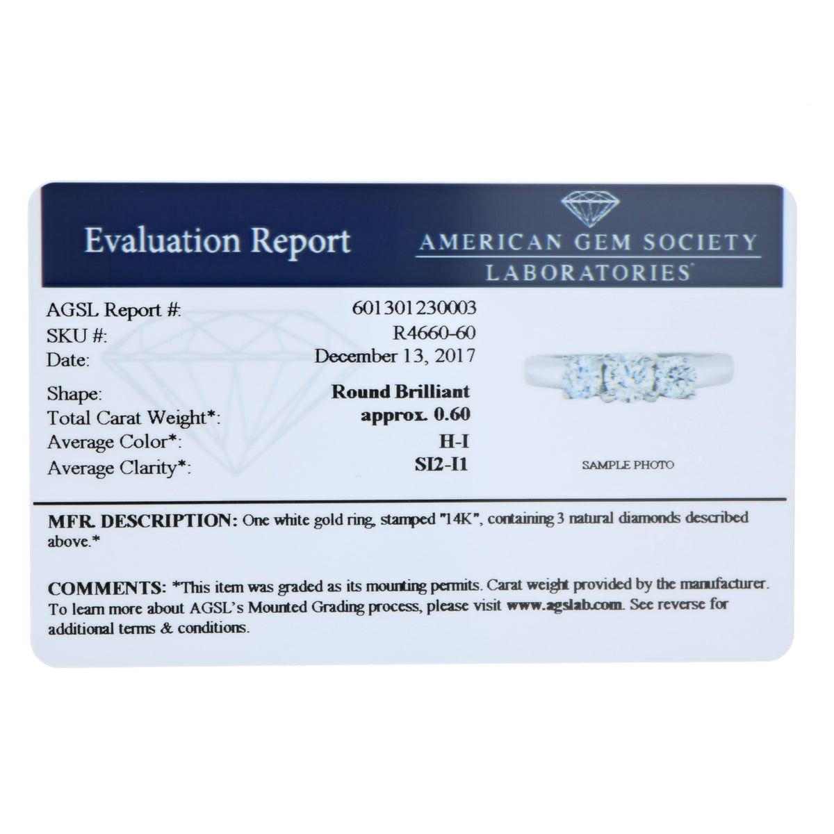 Handcrafted in 14K white gold. Features three natural round diamonds totaling 0.60 cttw. Diamonds have an I-J color grade and SI2-I1 clarity. AGS certified with a unique identification number. Prong setting ensures secure placement. April birthstone.