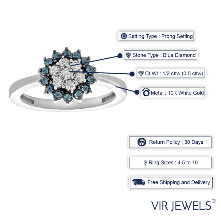 This 1/2 cttw Blue and White Diamond Cluster Composite Ring by Vir Jewels is a dazzling display of brilliance and contrast. The intricate cluster setting enhances the natural beauty of irradiated blue diamonds, allowing them to shimmer alongside classic white diamonds. Set in polished 10K white gold, this striking ring makes a bold statement, perfect for those who appreciate timeless elegance with a modern twist.