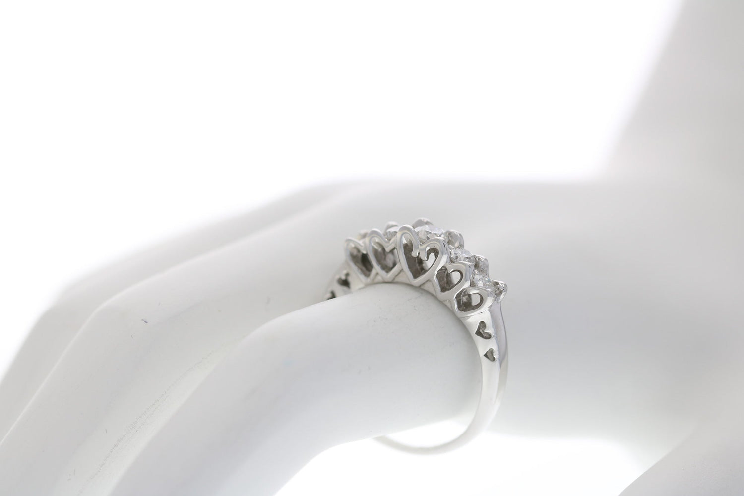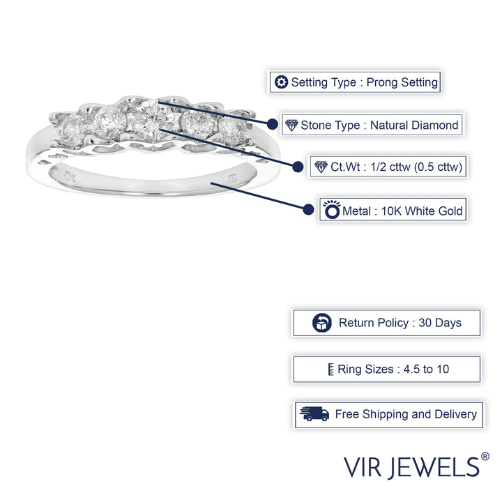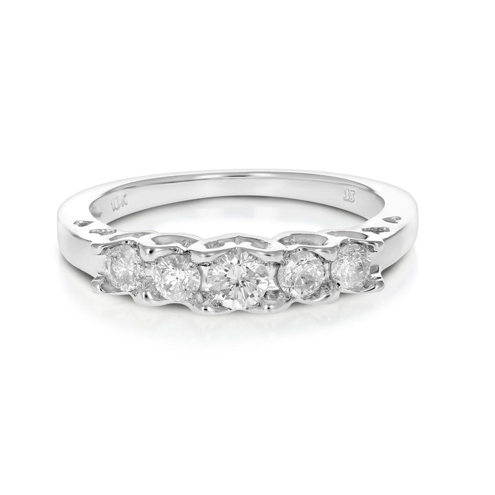 Handcrafted in 10K white gold. Features five natural round diamonds totaling 0.50 cttw. Diamonds have an I-J color grade and I1-I2 clarity.
