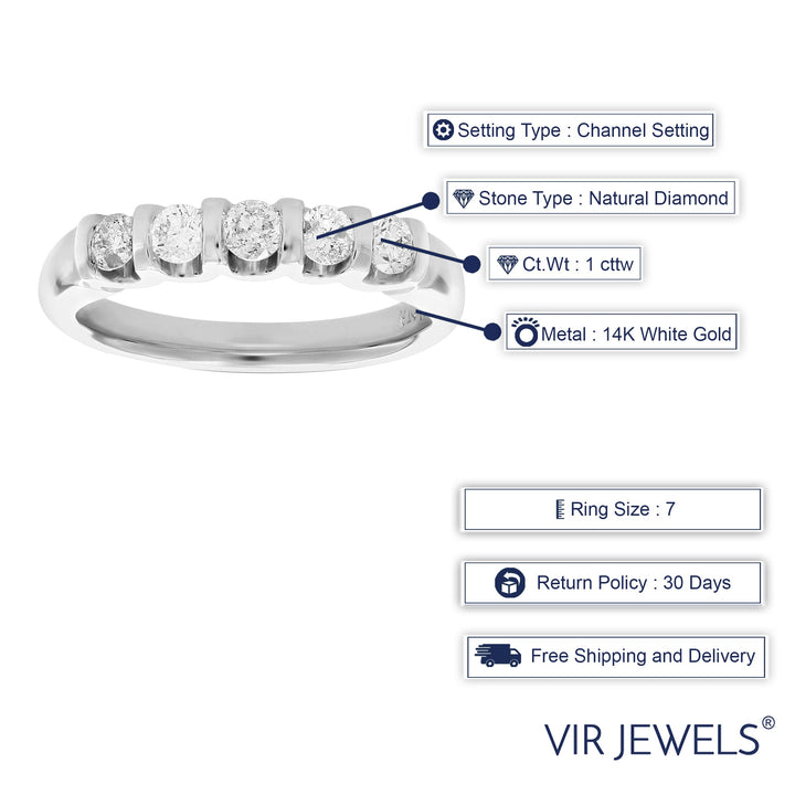 This 1 cttw Diamond 5 Stone Ring by Vir Jewels is a stunning symbol of love and commitment. Featuring five sparkling natural round diamonds, this ring is set in polished 14K white gold, offering a timeless design with a modern touch. Perfect for engagements, anniversaries, or any special occasion, this elegant piece is a lasting reminder of life's most precious moments. Available in multiple sizes.