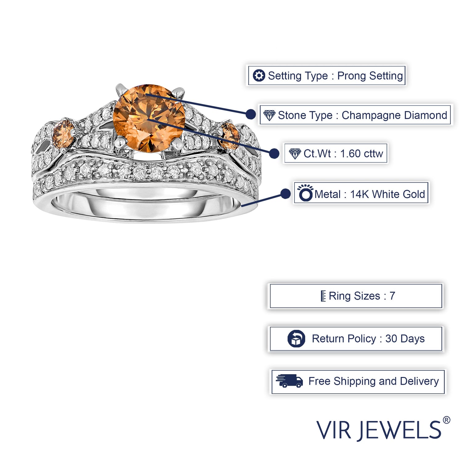 This 1.60 cttw 3 Stone Champagne and White Diamond Engagement Ring by Vir Jewels is a breathtaking symbol of love and commitment. The champagne diamonds, paired with the sparkling white diamonds, are set in a classic 14K white gold band, creating a luxurious and timeless design. This ring is perfect for those who want a unique and elegant engagement ring with a modern twist. Available in multiple sizes.