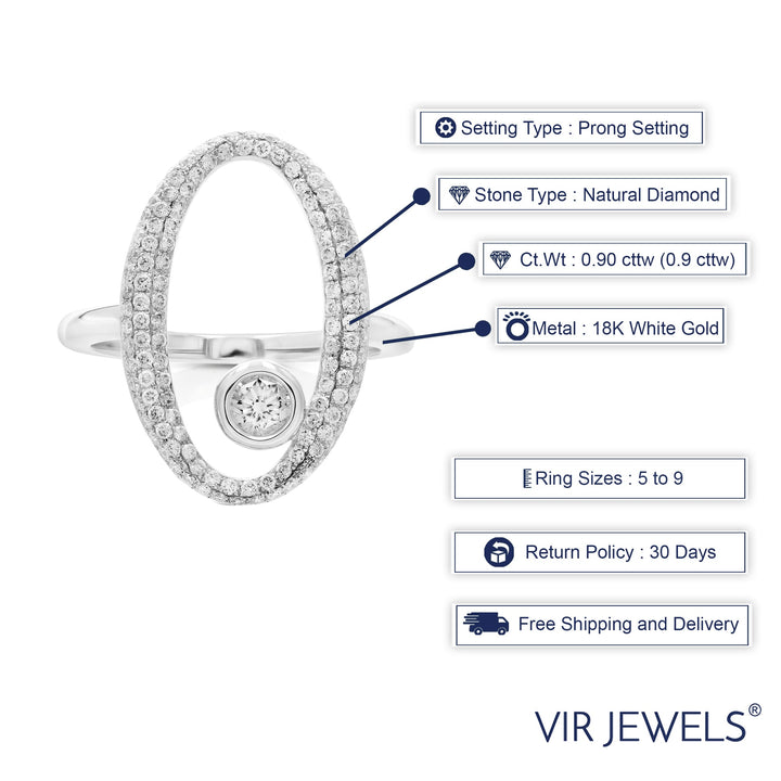 This 0.90 cttw SI1-SI2 18K White Gold Diamond Oval Ring by Vir Jewels is a breathtaking expression of elegance and luxury. The round-cut diamonds, totaling 0.90 cttw, are set in a polished 18K white gold band, creating a stunning contrast. This engagement ring’s oval shape symbolizes eternity, making it a perfect representation of lasting love and commitment. Available in multiple sizes.