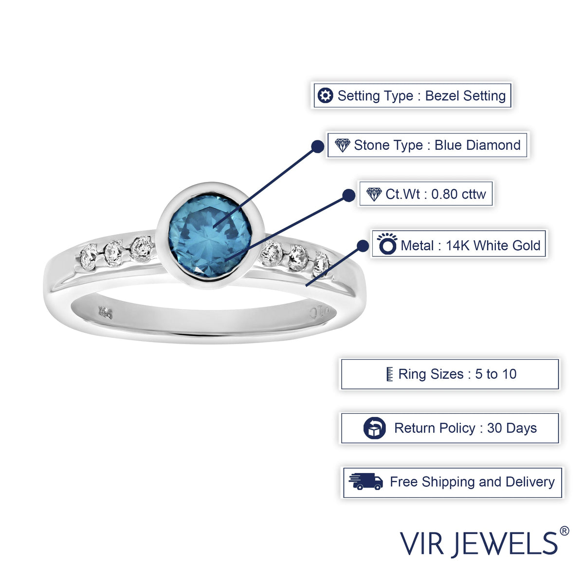 This 0.80 cttw Blue and White Diamond Engagement Ring by Vir Jewels combines the elegance of blue and white diamonds in a brilliant display of color contrast. The blue diamonds represent fidelity and deep love, while the white diamonds symbolize purity. Set in 14K white gold, this ring offers an exquisite balance of color and brilliance.