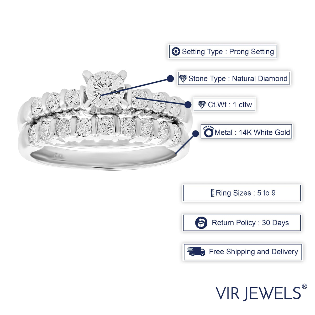 This 1 cttw Diamond Channel Set Wedding Engagement Ring Set by Vir Jewels embodies elegance and sophistication. With its sparkling round diamonds set in a channel design, this bridal set in 14K white gold symbolizes eternal love. This engagement ring and matching wedding band set is a timeless choice for brides seeking classic beauty.