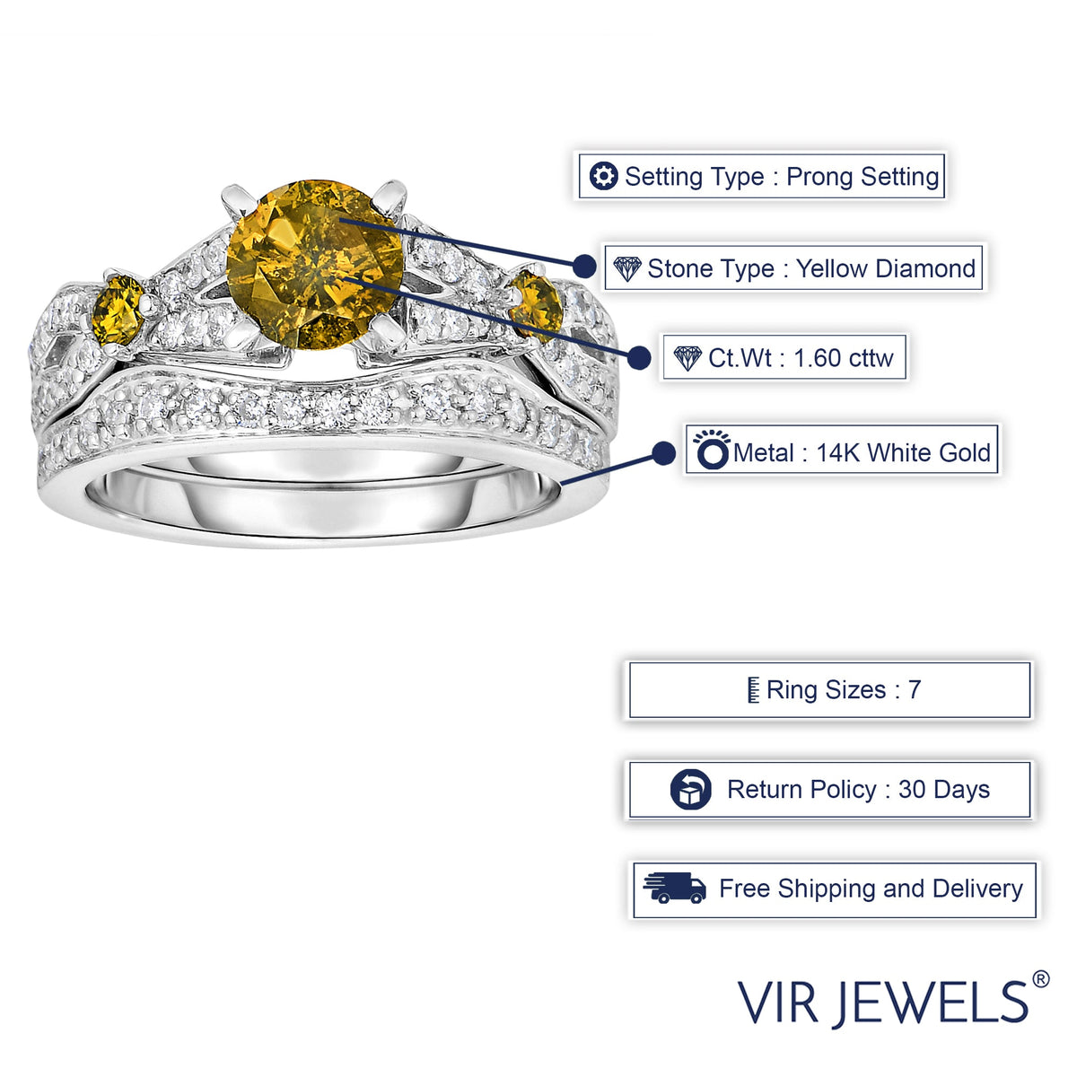 This 1.60 cttw 3 Stone Yellow and White Diamond Engagement Ring by Vir Jewels showcases a sophisticated combination of irradiated yellow and white diamonds. The 14K white gold setting enhances the sparkling diamonds, representing strength and love. This ring is ideal for someone who appreciates unique and bold designs.